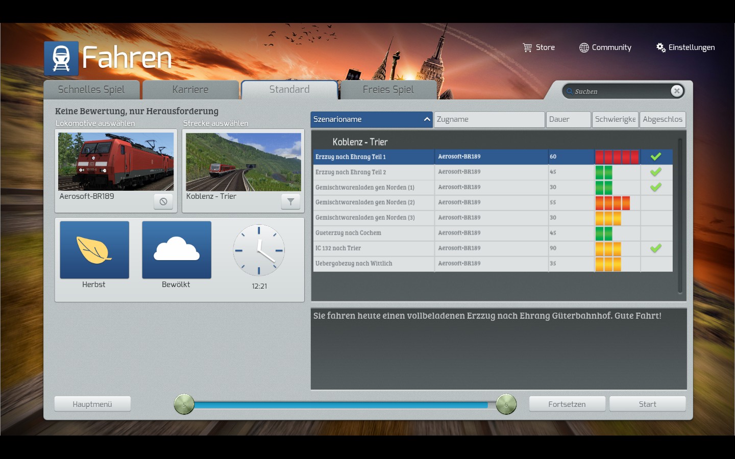 Ich habe tatsächlich Einstellungen gefunden, mit denen die Strecke meines Erachtens noch recht gut aussieht und mit welchen ich jetzt 2 Szenarien ohne irgendeinen Absturz abschliessen konnte. Es handelt sich und die Szenarien "Erzzug nach Ehrung Teil 2" sowie "Adventsmarktpendel Wittlich - Koblenz". Folgendes ist mir dabei aufgefallen: