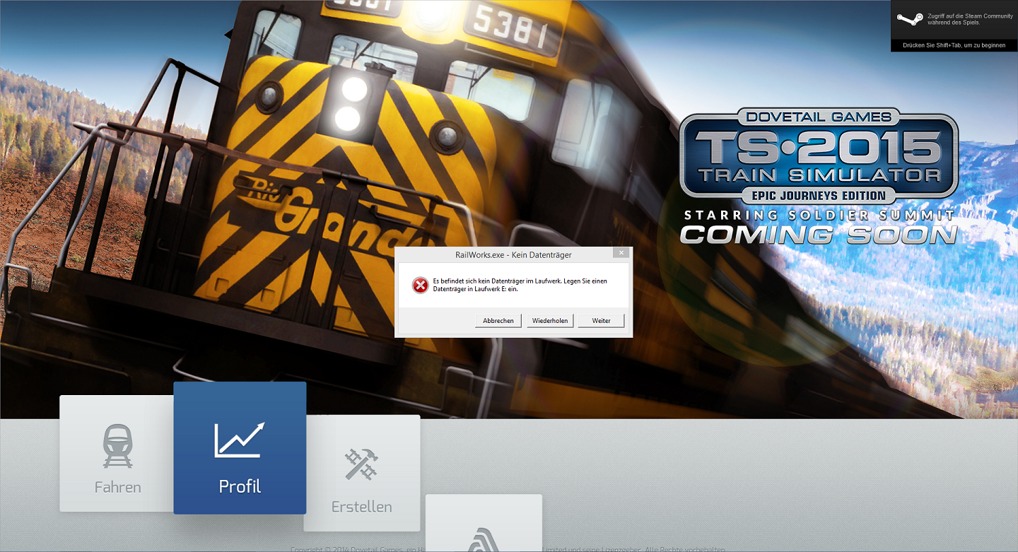 Ich habe seit einigen Tagen das Problem, dass der TS beim Starten die Fehlermeldung "Railworks.exe - Kein Datenträger in Laufwerk E:" (Laufwerk E: ist bei mir das DVD Laufwerk). Habe dann die Möglichkeit auf abbrechen, Wiederholen und weiter zu klicken. Klicke ich auf Weiter oder auf Abbrechen schmiert der TS mit der saved-dump Meldung ab, kurz darauf kommt die Meldung dass der Vorgang "written" im Speicher nicht durchgeführt werden kann.