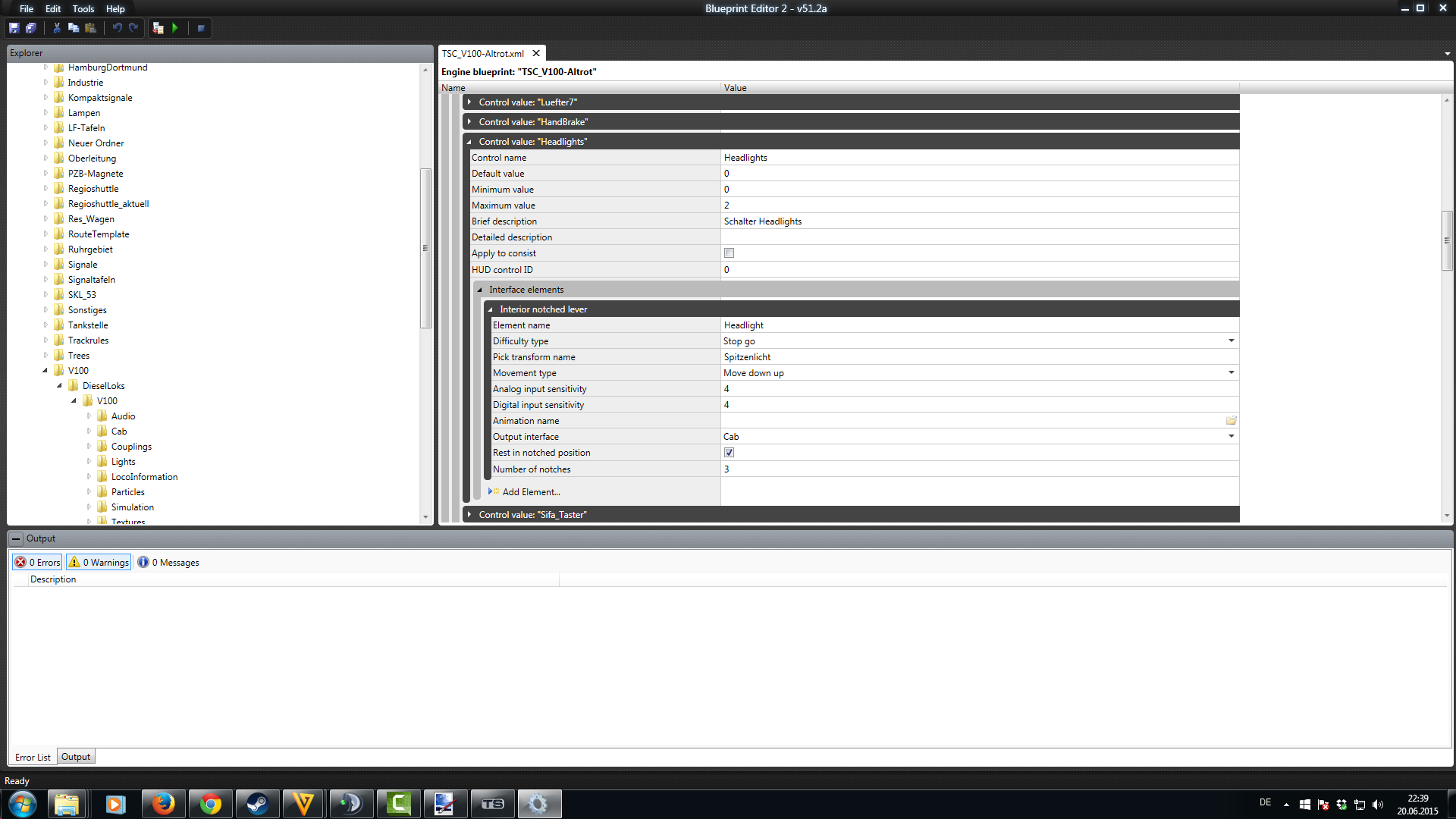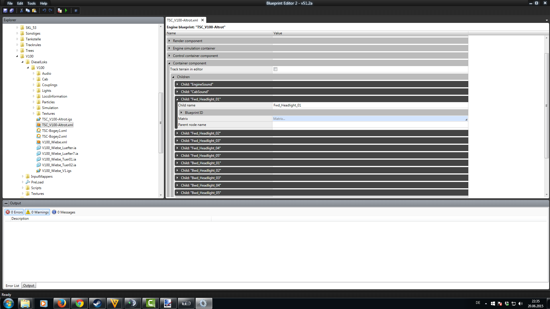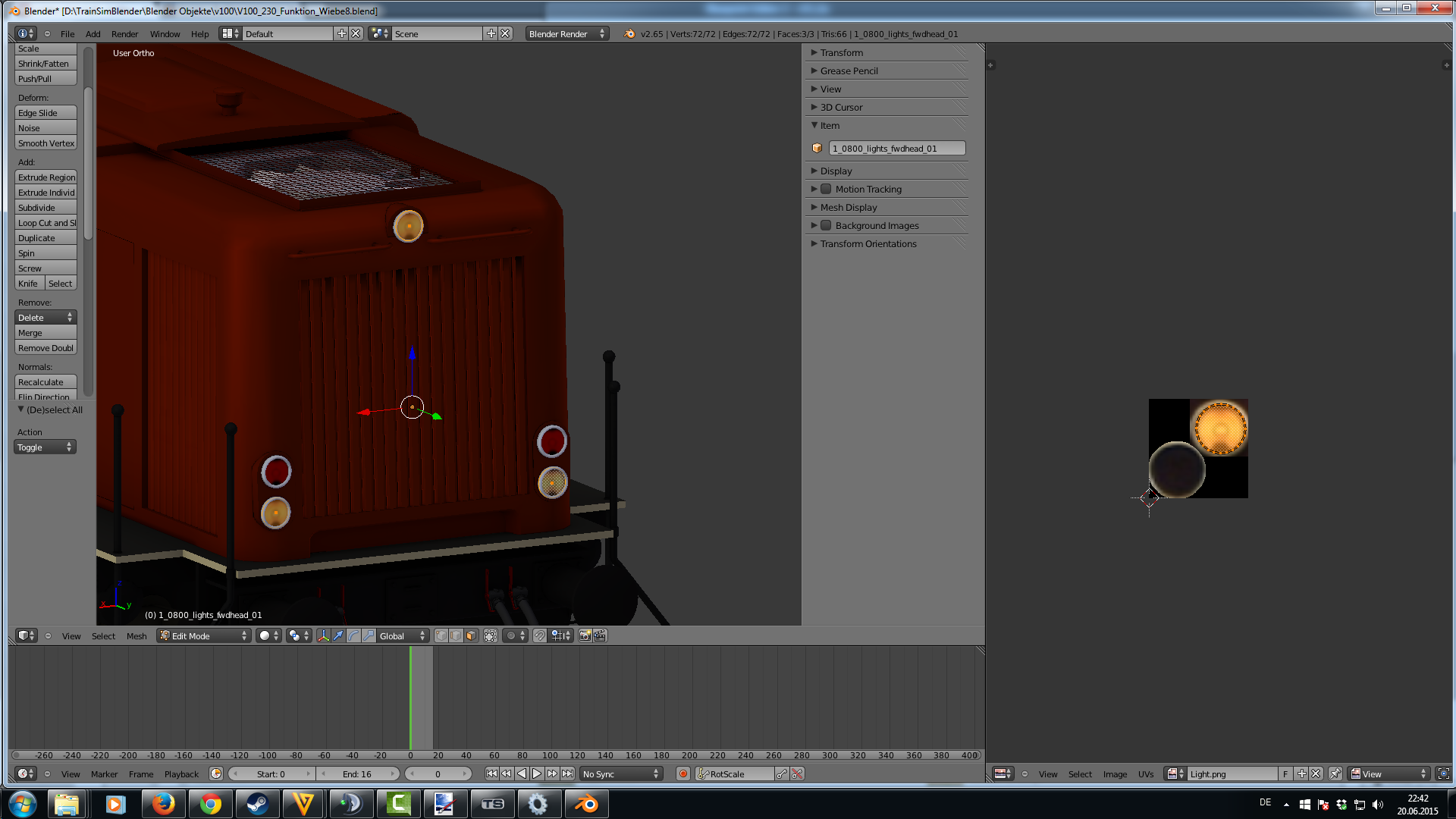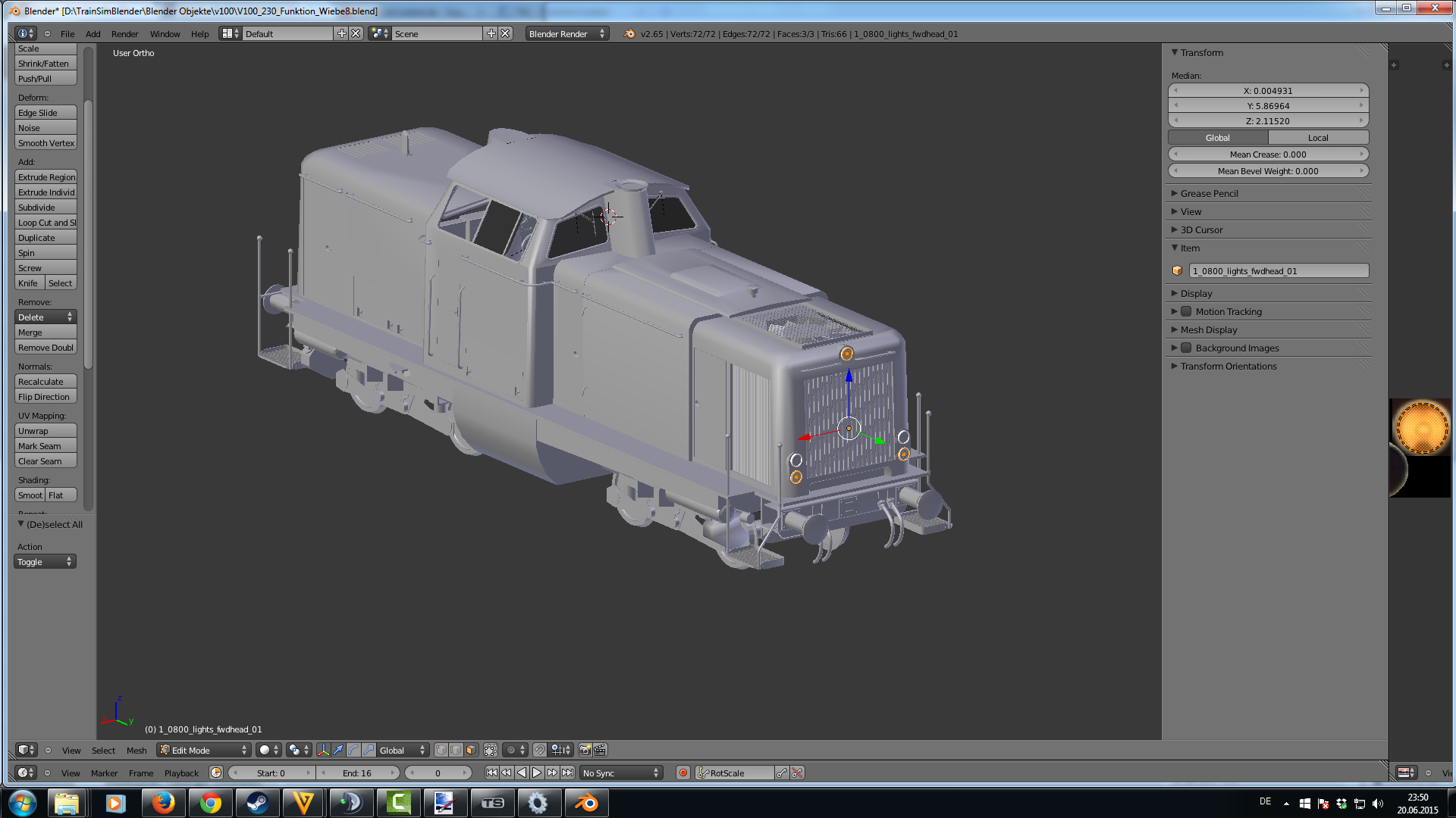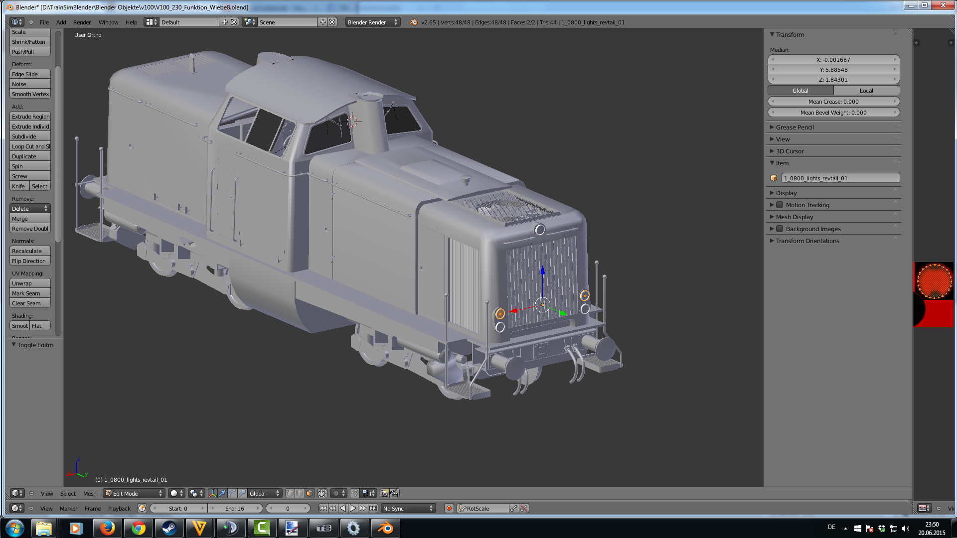 ich versuche gerade eine eigene Diesellok mit Blender zu bauen, was soweit ganz gut klappt. Jedoch habe ich Schwierigkeiten mit den Spitzen- und Schlußlichtern. Wie im Manual angegeben habe ich sie mit lights_fwdhead, lights_fwdtail etc benannt. Zum Testen habe ich vorne und hinten je ein ein weißes Spitzenlicht und ein rotes Schlußlicht gebaut. Der Shader ist AddATex, was in der GeoPCDx Datei zu UnlitSingle konvertiert wird. Das ist soweit ich das bei anderen Loks nachgesehen habe, korrekt. Das Problem ist nun, dass nur die roten Schlußlichter funktionieren, aber sie sind immer beide gleichzeitig an, egal ob der Schalter in Stellung 1 oder 2 ist (bei 0 sind sie aus). Die weißen Spitzenlichter funktionieren überhaupt nicht. Wenn ich Wagen ankupple, geht das rote Schlußlicht immerhin auf der richtigen Seite aus. Das andere, das ja leider gleichzeitg angeht, bleibt an. Um zu prüfen, ob mit den weißen Lichern schon in Blender was nicht stimmt, habe ich deren Namen mit den Schlußlichtern getauscht. Dann funktionieren sie, also sind sie wohl in Ordnung. Also scheint lights_fwdtail und lights_revtail erkannt zu werden, aber sie sind immer gleichzeitig an, lights_fwdhead und lights_revhead werden insofern erkannt, dass die Lichter nicht zu sehen sind, aber sie lassen sich nicht anschalten.