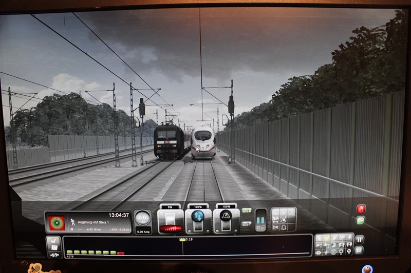 Ich soll mit dem ICE 3 von München nach Augsburg fahren und dort Fahrgäste abholen. In München & Pasing konnte ich die Fahrgäste aufnehmen und meine Fahrt fortsetzen . 53 km vor Augsburg tauchte in meinem Gleis dieser ICE 3 auf. Beim 2. Anlauf hielt ich ca 20 Meter hinter dem ICE und warte auf die Dinge die da kommen sollen. Es passiert aber nichts