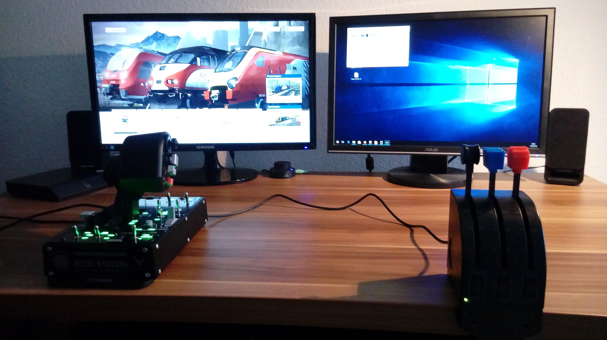 Derzeit mit 2 Throttles (Thrustmaster Hotas Warthog und Logitech Flight Throttle Quadrant). Auf dem rechten Monitor läuft der TS-MFD.