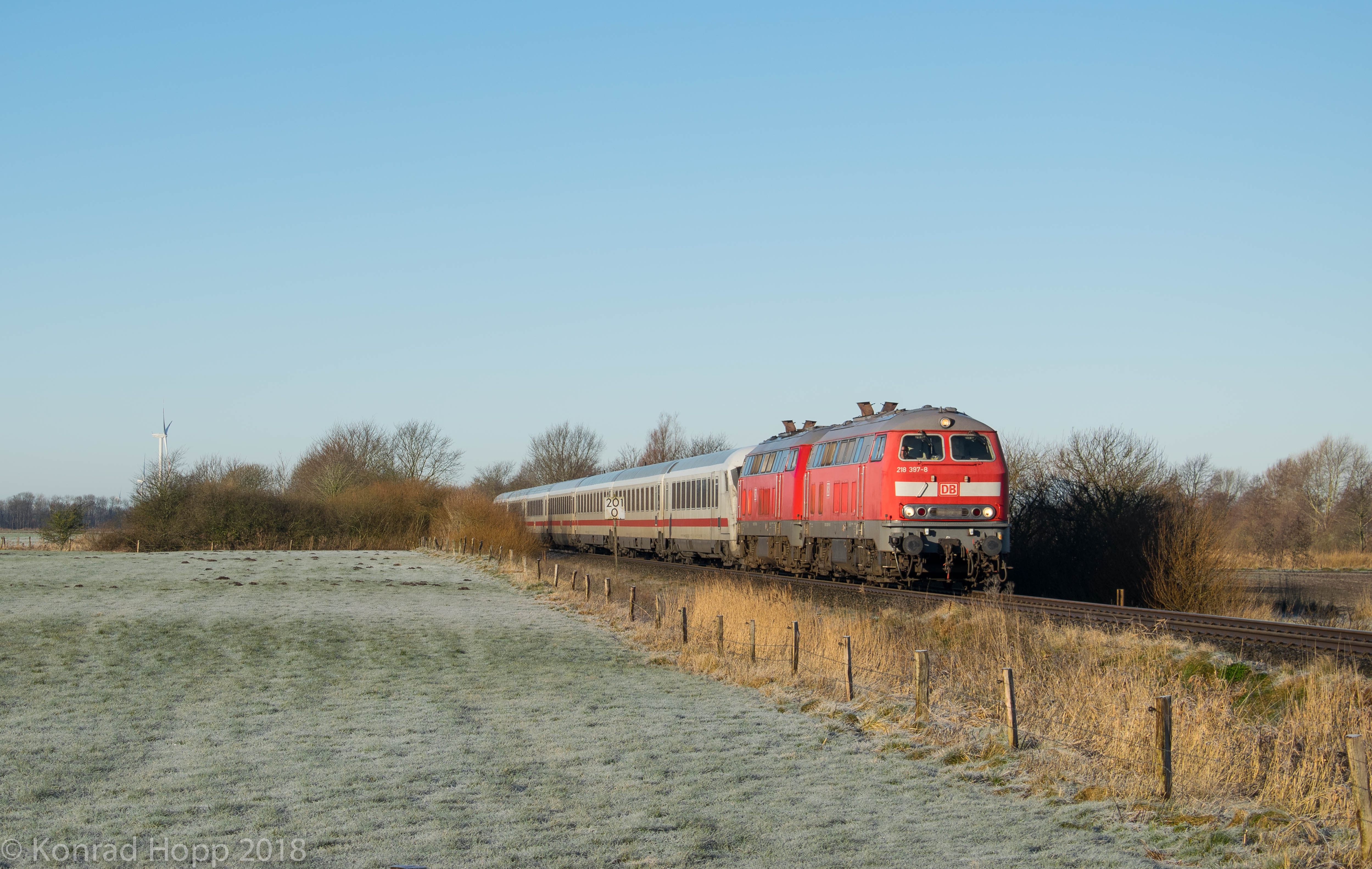 Gleich der erste Zug war der IC 2374 von Westerland nach Karlsruhe, gezogen von 218 397 und 218 322 kurz vor Niebüll.