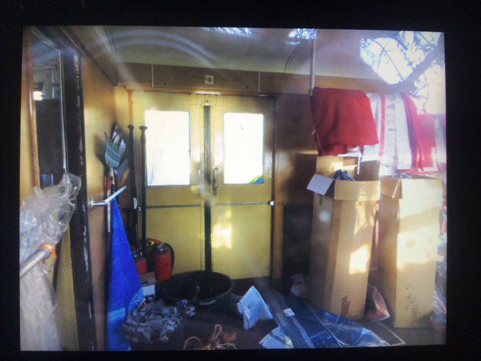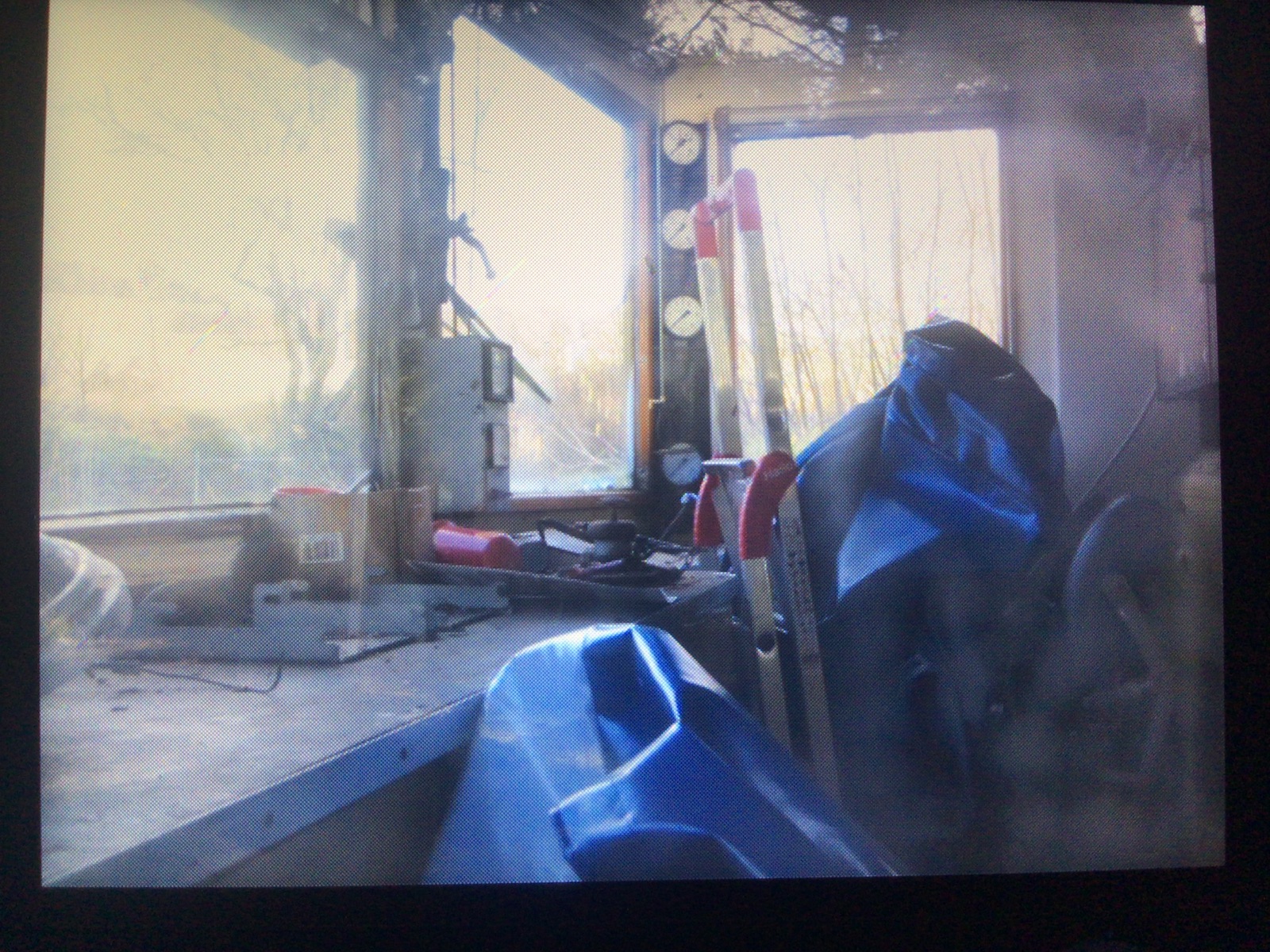 Innendienst steht Gerümpel, aber der Führerstand ist noch mehr oder weniger komplett vorhanden, inklusive Fahrtaster und Schalter an der Fahrerstandsrückseite: