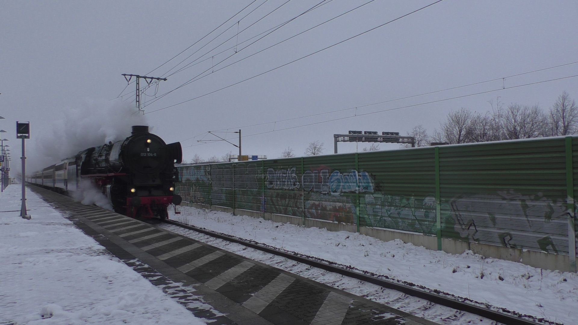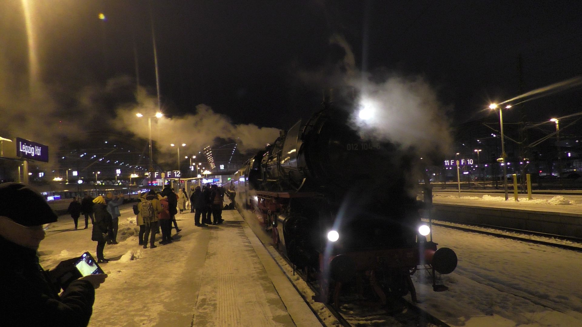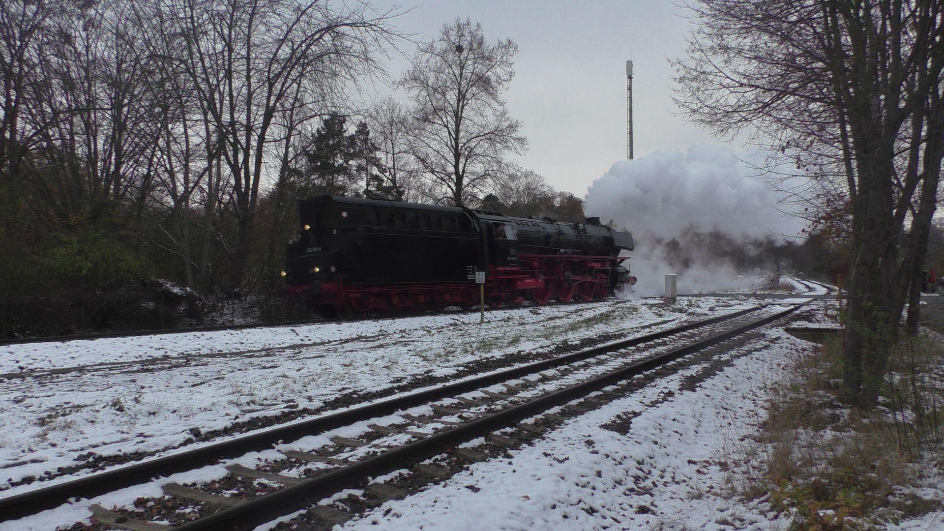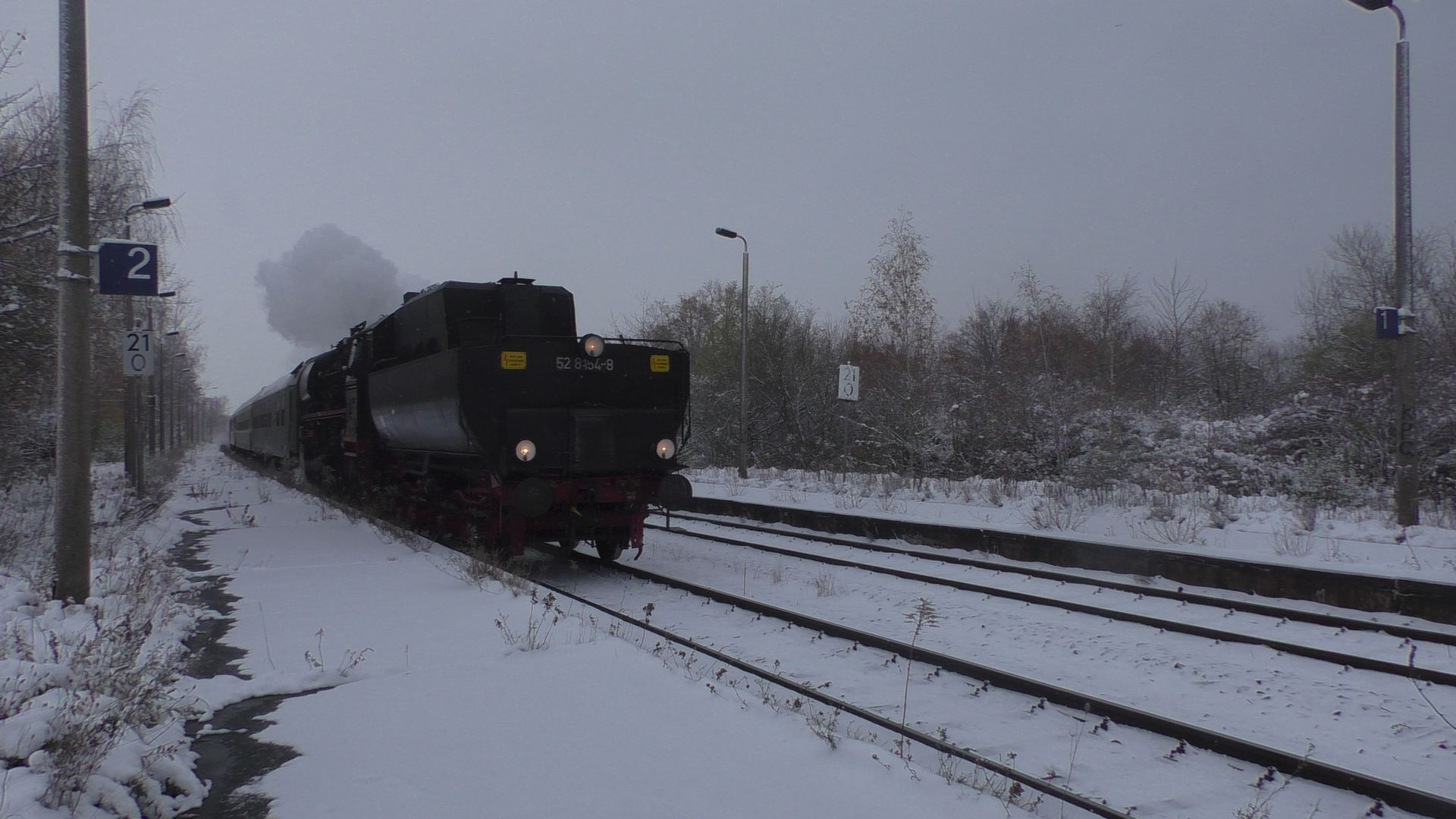 Am ersten Adventswochenden gehen traditionell die ganzen Dampfsonderzüge auf Nikolausfahrten. So fuhr gestern Nostalgiezugreisen mit der Schnellzugdampflok 012 104-6 (alias 01 1104) von Braunschweig nach Leipzig. In Leipzig gab es dann von Gleisglück Stadtrundfahrten mit der 52 8079 und E77.10. Am heutigen ersten Advent fuhr das Eisenbahnmuseum Leipzig Plagwitz mit ihrer 52 8154 die beliebten Pendelfahrten von Plagwitz nach Zeitz, welchen ich in Leipzig-Knautnaundorf bei frischem Neuschnee verewigt habe