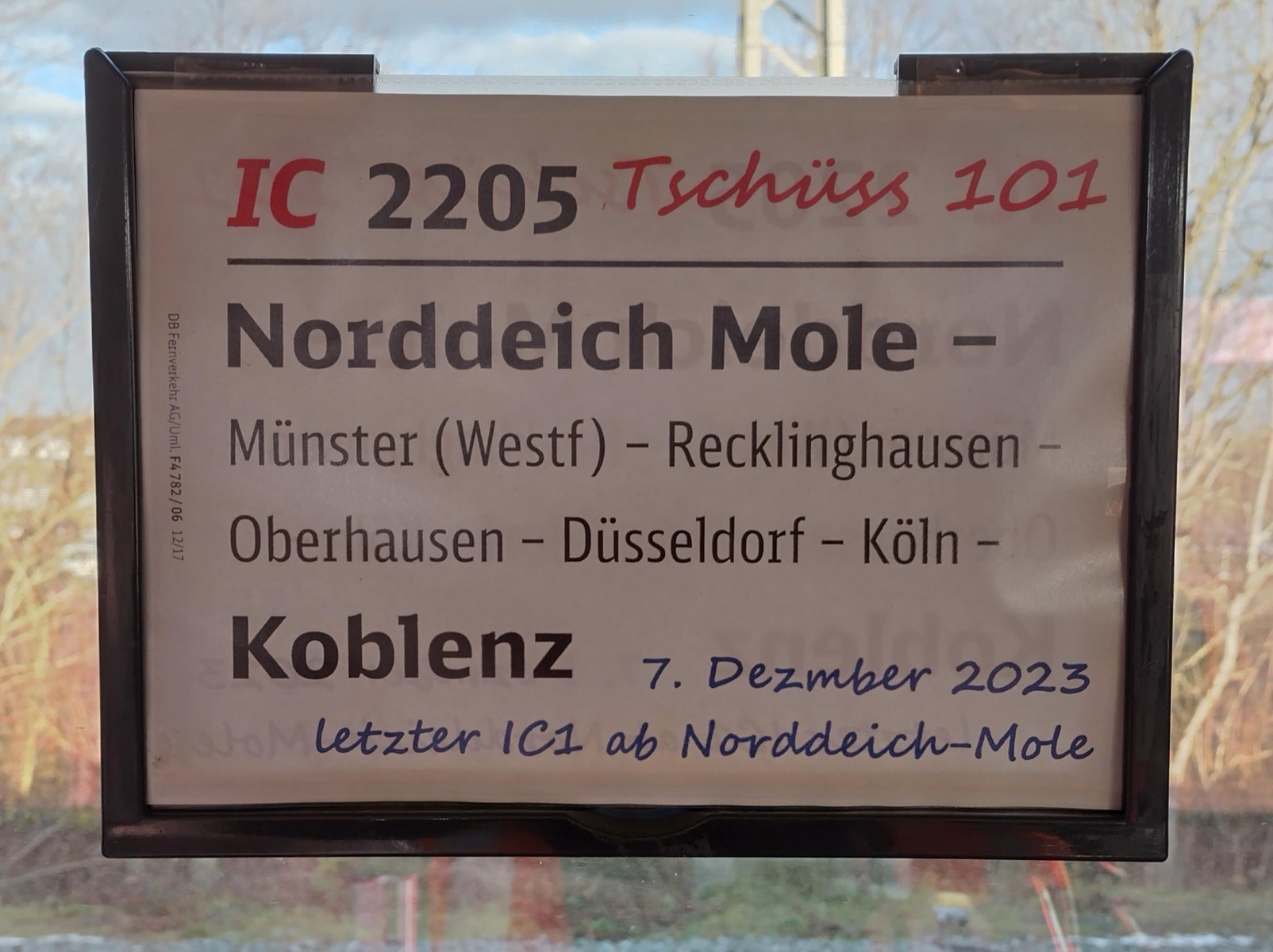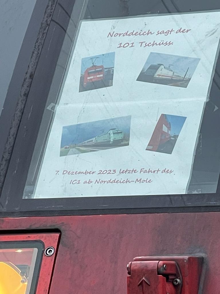 Schluss aus und vorbei am Heutigen 07.12.23 war es dass letzte mal dass ein IC 1 den Bahnhof von Norddeich Mole erreicht hat und abgefahren ist.Somit endet auch die Zugleistung IC2206 Koblenz Norddeich Mole und IC2205 in die Gegenrichtung. Morgen fährt die Leistung nicht, und am Wochenende nur bis Emden (SEV Zwischen Emden-Norddeich Mole) . Somit heißt es bye bye IC 1 mit BR 101 und Steuerwagen ab Sonntag verkehren dann ICE Züge auf dieser Leistung als ICE 606/605.