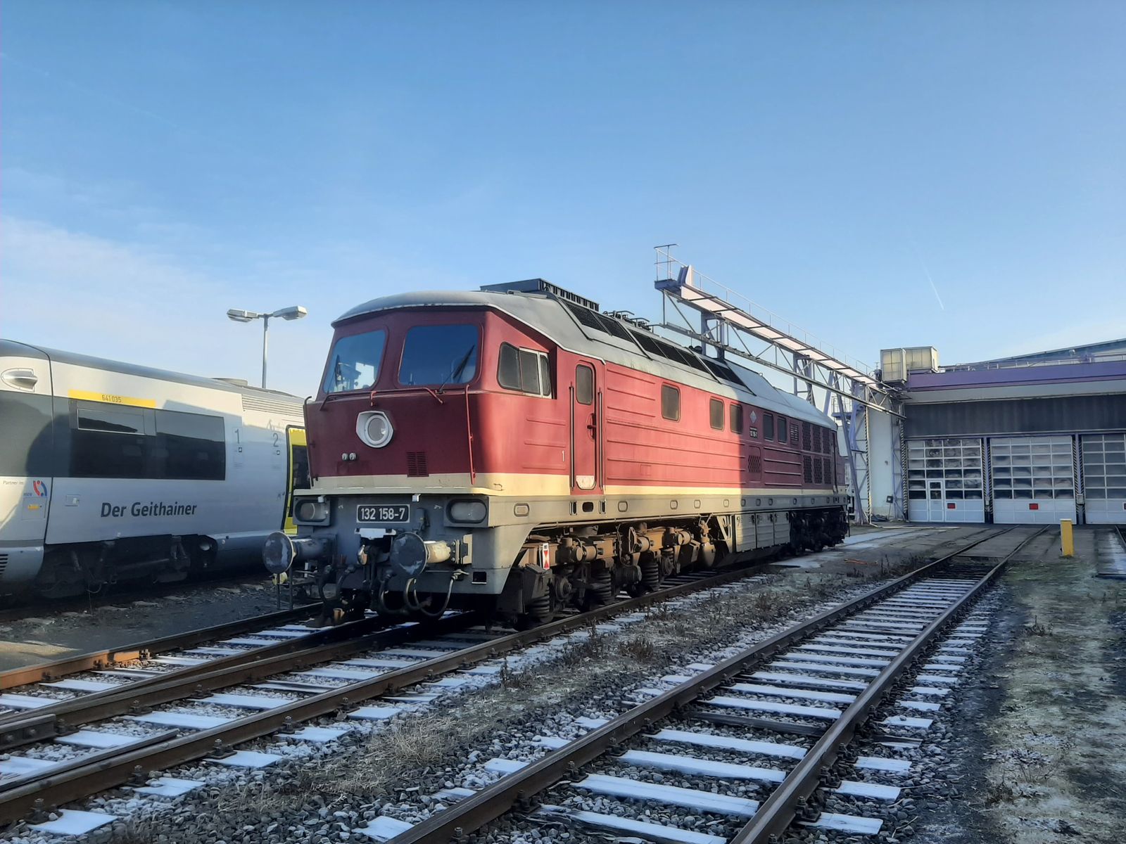 Heute konnte ich nach langem mal wieder mit der guten 132 158 fahren. Ursprünglich war 192 013 geplant welche nicht rechtzeitig in der Werkstatt fertig wurde, die daraus resultierende Ersatzlok in Form von 248 022 wurde auch schnell wieder verworfen, da die vermutlich eingefroren war und nicht funktionierte, so blieb dann nur noch die altbewährte sowjetische Technik über, welche bei jedem Wetter fährt und einen nicht im Stich lässt.