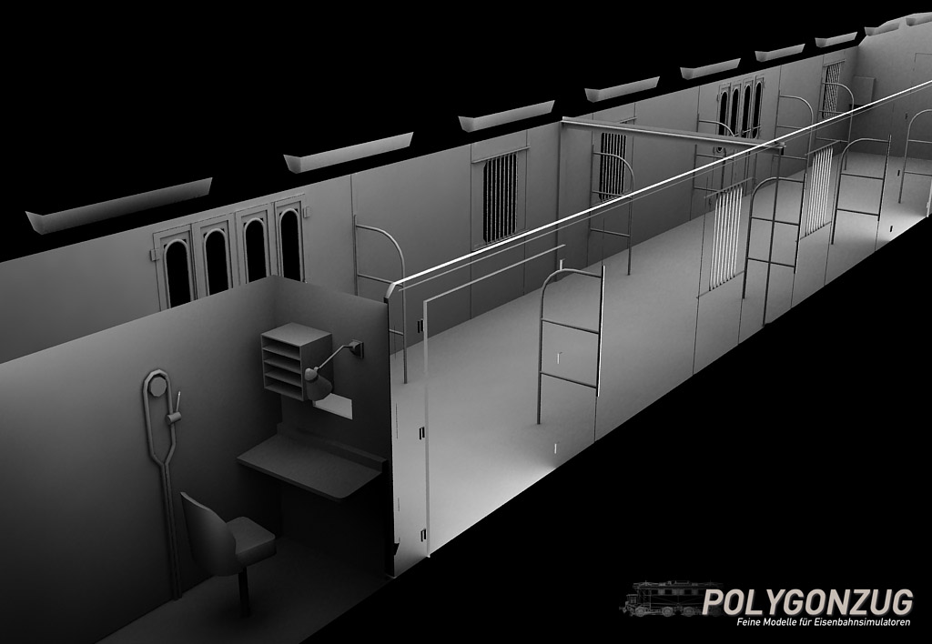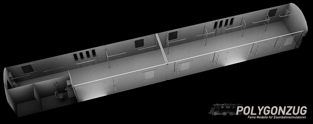 Nicht zuletzt dank @Gainmaster, der sich in das Innere des Kranichsteiner MDyg986 begeben und mir von dort eine Reihe ausgesprochen hilfreicher Fotos geschickt hat, bin ich seit dem letzten Beitrag gut vorangekommen. Inzwischen ist der reine Modellbau an der Grundvariante bis auf eine peinliche Kleinigkeit, die ich eben erst entdeckt habe, abgeschlossen. Abgeschlossen ist auch das Mapping, was bei diesen Wagen mit ihrer außenliegenden Tragstruktur gar nicht so unaufwendig war.