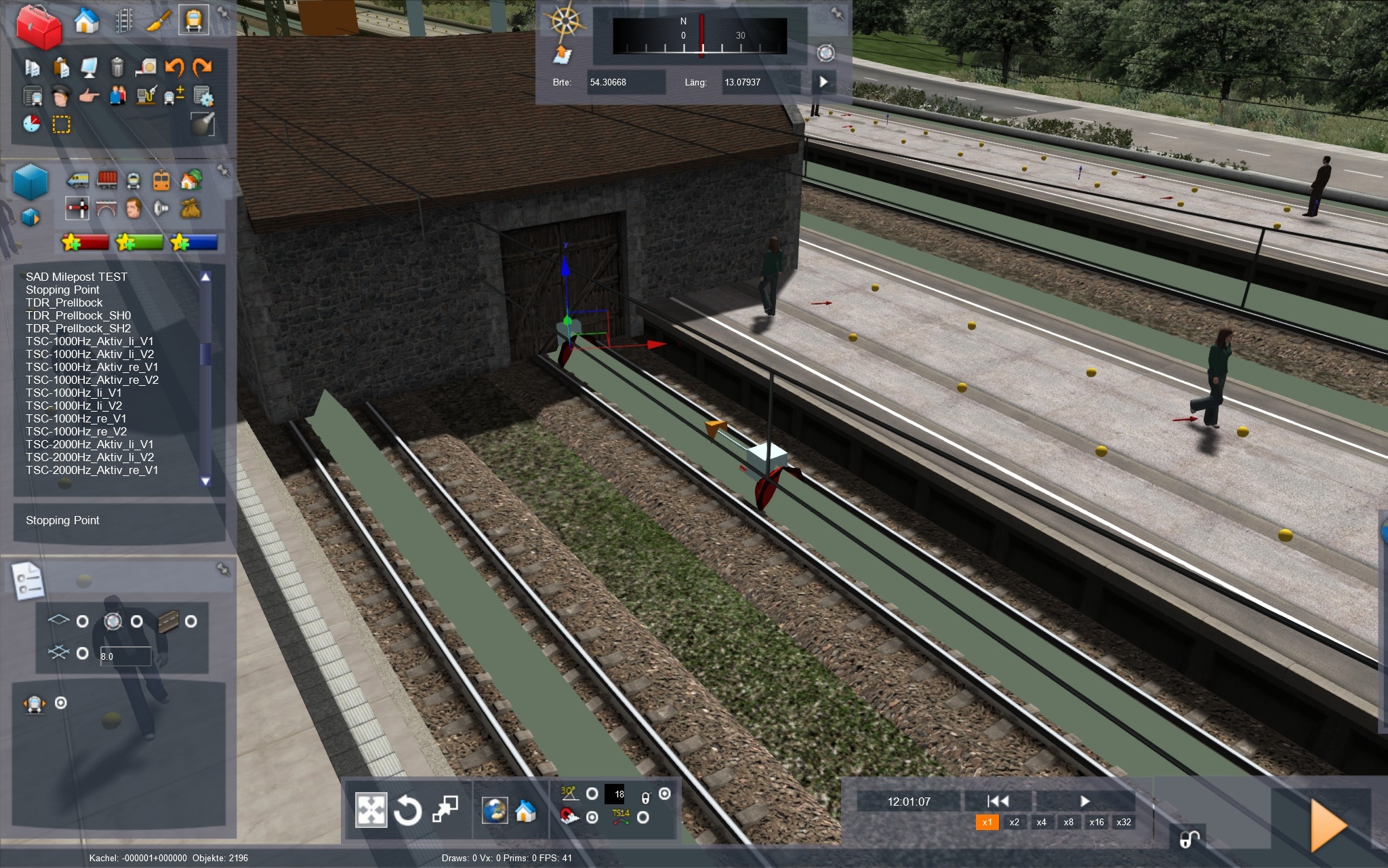 - Bei Link 2 wird es da schon schwieriger aber mit einem kleinen Trick geht auch das sehr einfach. Wir erstellen für die Rangierabteilung den Fahrplan/Arbeitsauftrag. Ist dieser erstellt nutzen wir die Vorspulfunktion und lassen den Zugverband an die beabsichtigte Stelle fahren. Nun wird ein rechteckiges Objekt so platziert das eine Seite genau zwischen den Puffern des letzten Wagens und der Rangierlok ist. An dieser Seite orientieren wir nun unseren Link 2! (Ganz wichtig! Nach Platzierung des Gebäudes abspeichern und das Vorspulen zurücksetzen, jegliches Zugmaterial was sich bis dato bewegt hat sollte dann auch wieder an den Ausgangsort gesetzt werden.