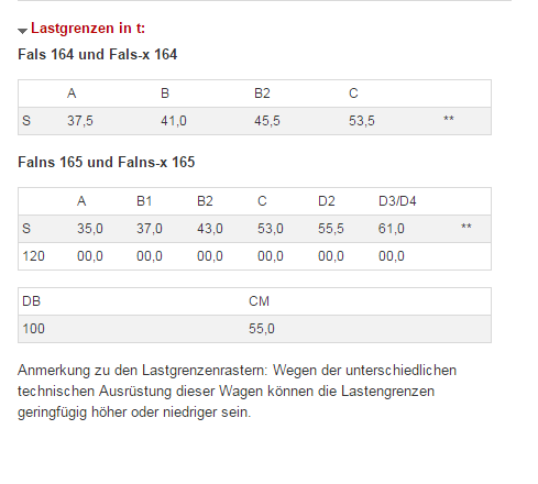 Wie der Thread-Titel schon besagt würde ich gerne erfahren, wie man Lastgrenzen liest und versteht. Dazu hab ich als Beispiel mir Lastgrenzen von dieser Seite (http://www.gueterwagenkatalog.…736/fals_164.html?start=0) abfotographiert.