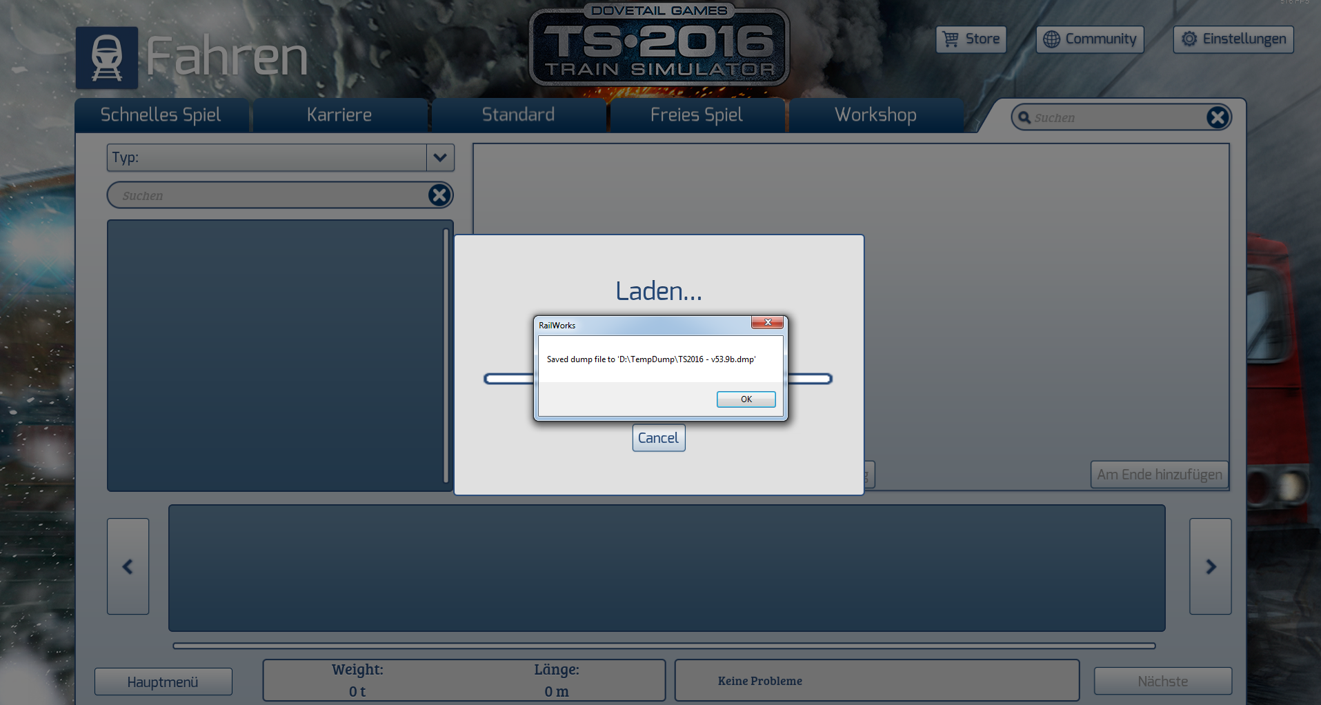 Ich habe schon seit längerem das Problem, dass wenn ich in den Build Contest gehe und mir ein ZUg erstellen will, der TS mit einem Save Dump Fail abstürzt.