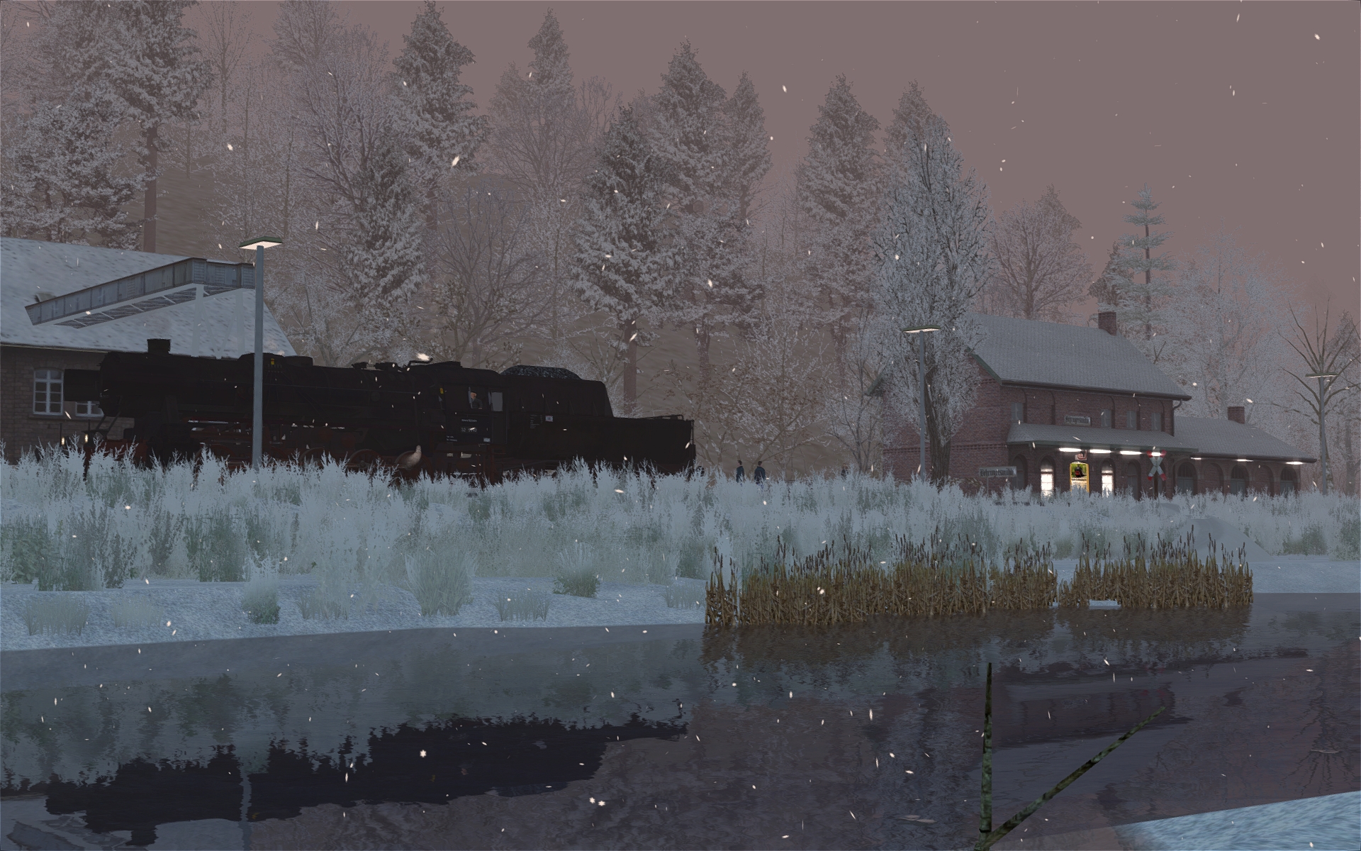 Bilder von der heutigen Testfahrt: Bahnhofsschilder erstellt (halb real, halb Paint) und kleinere Details gesetzt und Dinge angepasst, vor allem Bü. Vor Gößweinstein dann ein Dump bei nicht einmal 2 GB Ramverbrauch, aber beim Laden einer Kachel mit über 3400 Objekten. Ist das eventuell schon wieder zu viel für den TS? Ich könnte es auf knapp 3100 reduzieren, indem ich den Wald dort etwas auslichte. Ansonsten könnte ich schon wieder kotzen ... Hab es dann gleich für den ersten Wintertest genutzt.