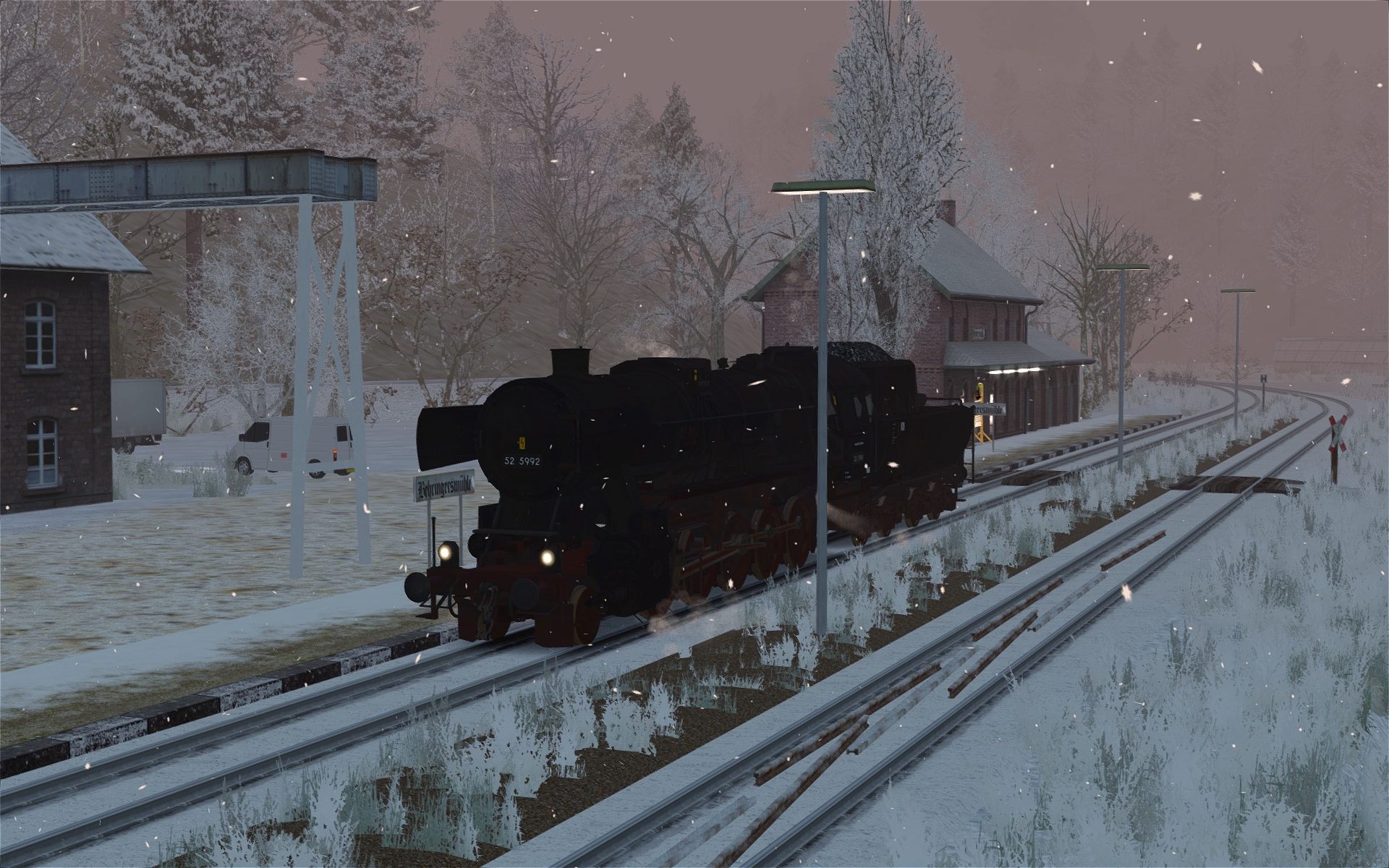 Bilder von der heutigen Testfahrt: Bahnhofsschilder erstellt (halb real, halb Paint) und kleinere Details gesetzt und Dinge angepasst, vor allem Bü. Vor Gößweinstein dann ein Dump bei nicht einmal 2 GB Ramverbrauch, aber beim Laden einer Kachel mit über 3400 Objekten. Ist das eventuell schon wieder zu viel für den TS? Ich könnte es auf knapp 3100 reduzieren, indem ich den Wald dort etwas auslichte. Ansonsten könnte ich schon wieder kotzen ... Hab es dann gleich für den ersten Wintertest genutzt.