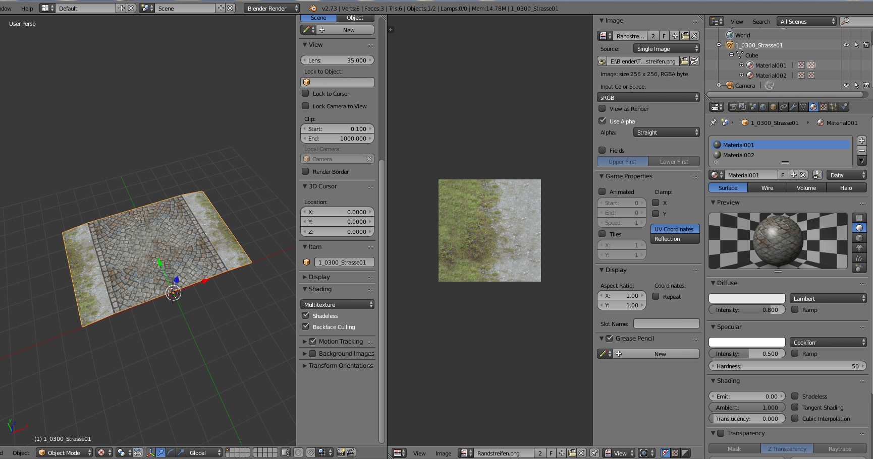 Zu deinem Problem mit den zwei Materialien, ich würde dort den Gehweg und die Pflasterstraße in einer Textur unterbringen. Und dann das ganze als ein Plane nutzen.