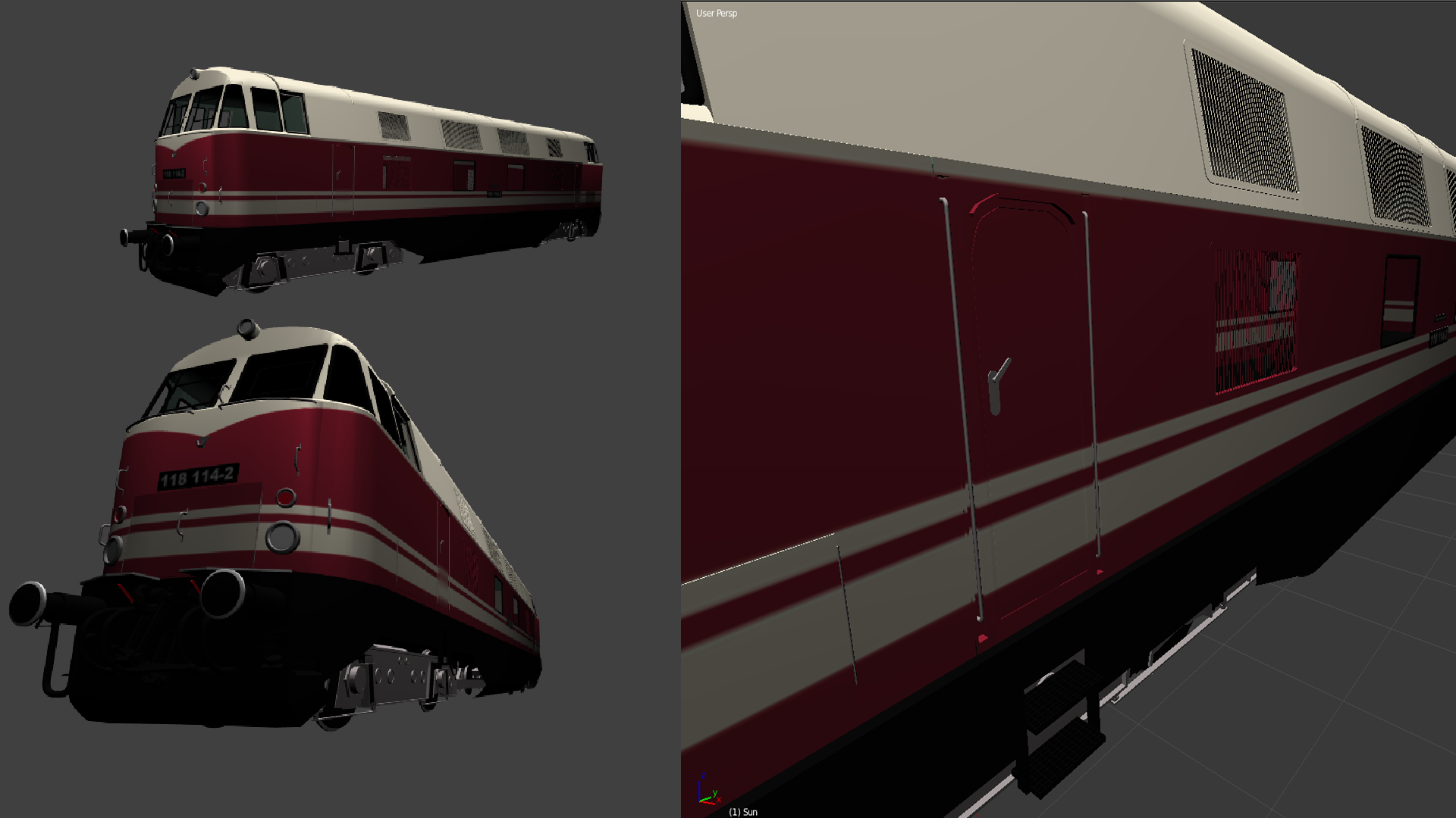 Den Handlauf am Einstieg würde ich etwas dicker machen, der sieht zu dünn aus. Und die Bogeys sollten auch mehr detailierter ausgestaltet sein.