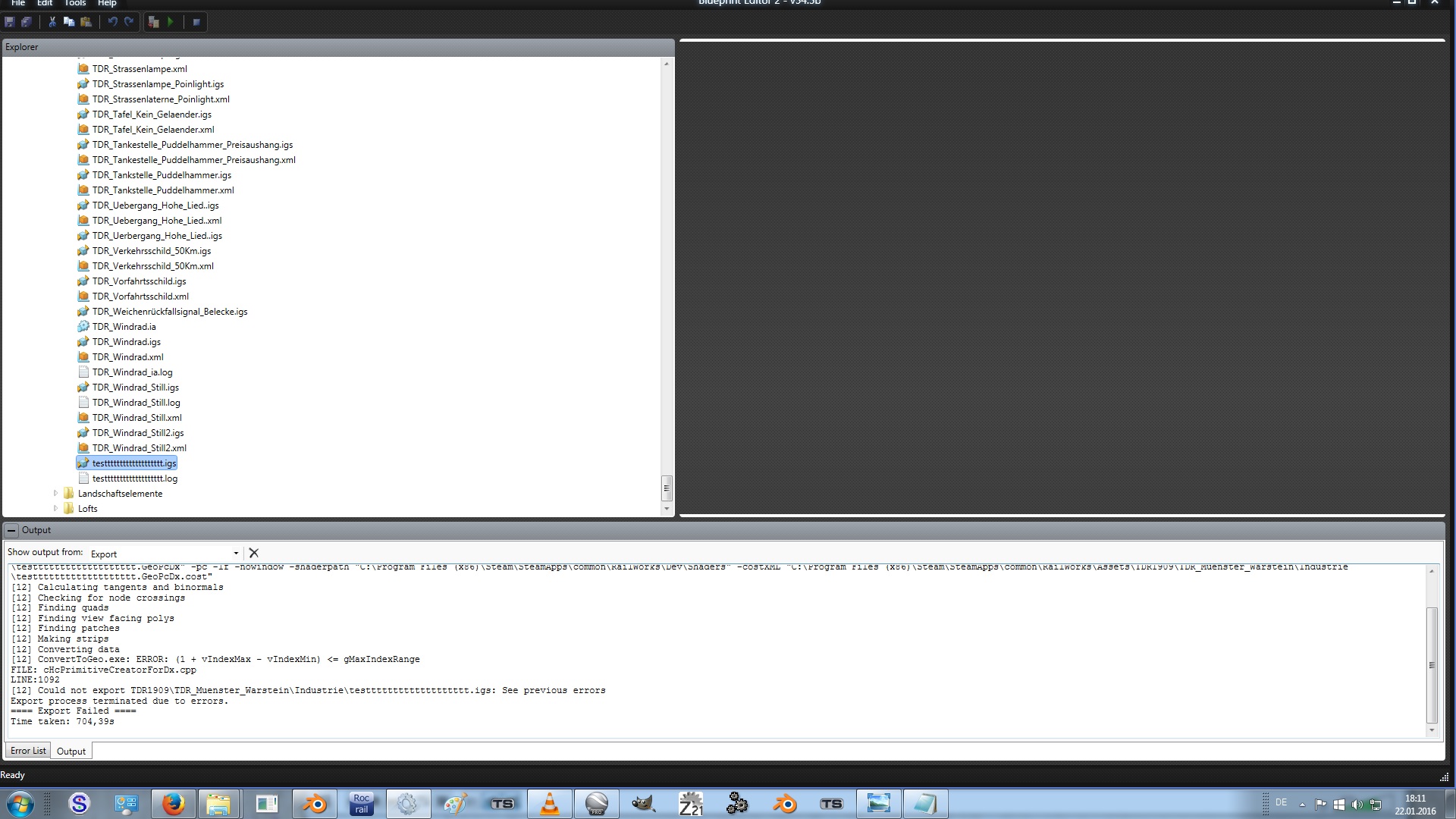 Hi Leute ich habe folgendes Problem beim mit dem Blueprint editor, ich bekomme immer diesen Fehler ausgeworfen ( [6] ConvertToGeo.exe: ERROR: (1 + vIndexMax - vIndexMin) <= gMaxIndexRange )