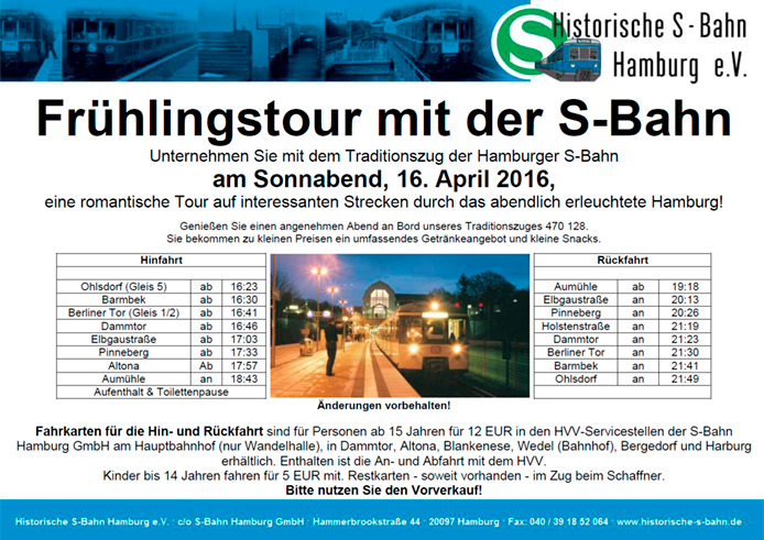 Wer in Hamburg wohnt, sollte mindestens 1x historische S-Bahn fahren... ist zumindest meine Meinung. Da ich Mitglied des Vers Historisches S-Bahn Hamburg e.V. bin, möchte ich auch gerne das Fahrtenprogramm 2016 mit euch teilen. Vielleicht sieht man sich ja mal im ET 470 128 ![]()
