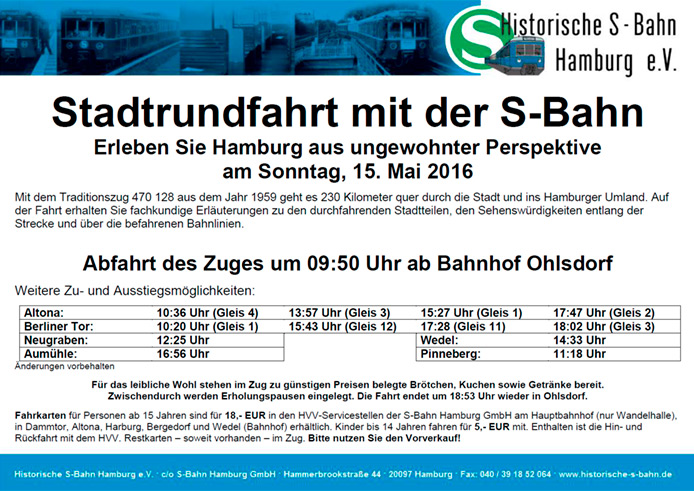 Stadtrundfahrt Fahrt über das gesamte Netz der Hamburger Gleichstrom-S-Bahn mit fachkundiger Erläuterung, Imbiss u. Getränken* Fahrpreis: 18 EUR |