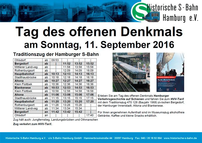 Tag des offenen Denkmals Fahrten zum HVV-Tarif aus Anlass des Tages des offenen Denkmals Mitfahrt zum HVV-Tarif |