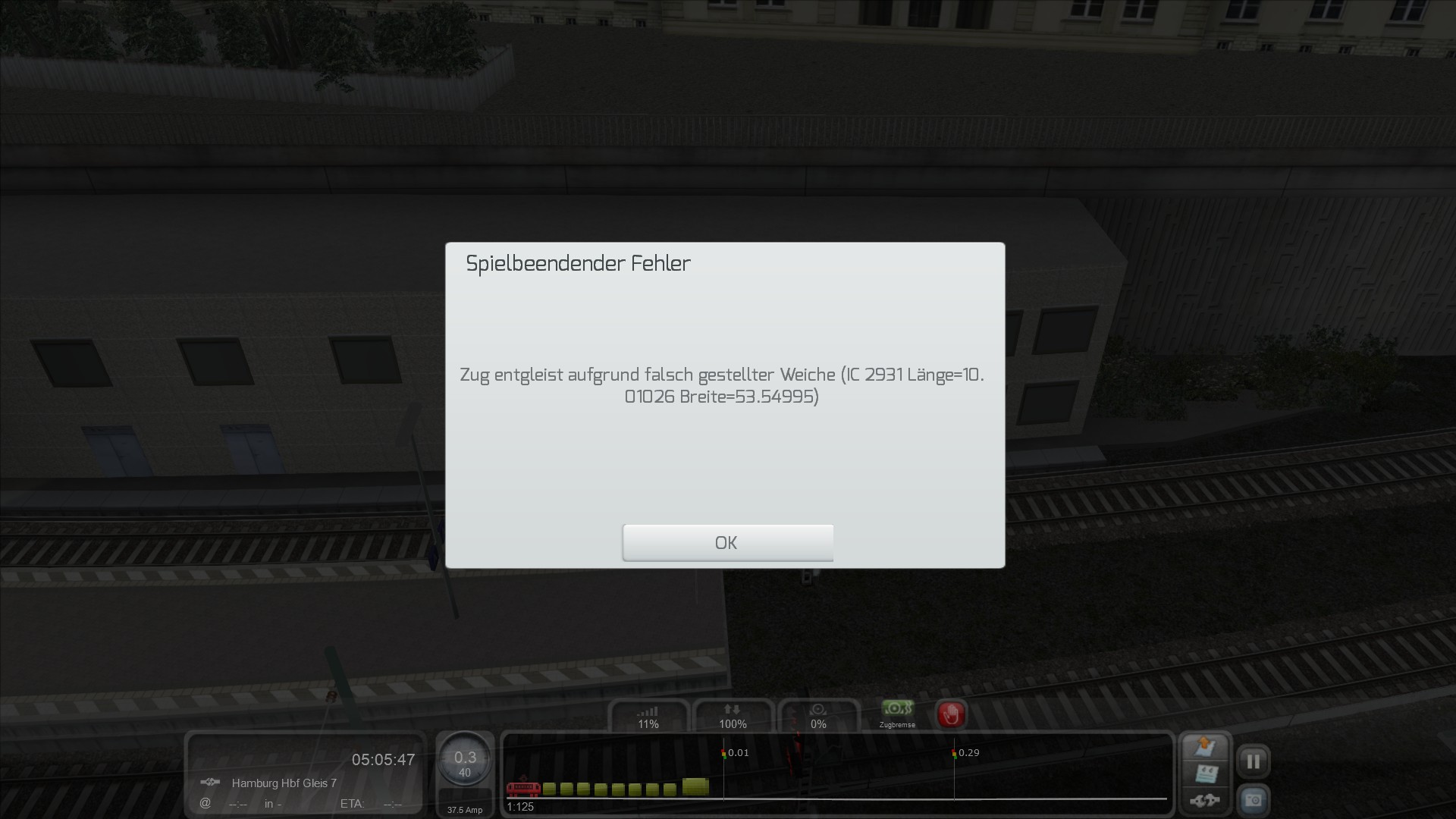 Ich hab mal ein Problem: Ich hab vorhin ein kleines Szenario gebaut und es hat eigentlich geklappt. Dann wollte ich es testen (Nicht aus dem Editor hinaus, ich weiß dass da solche Buggs enstehen) aber ich bin gefahren und auf einmal bin ich aus dem nichts aus der Schiene geflogen. Im F3 Menü wurde auch ein Prellbock angezeigt.