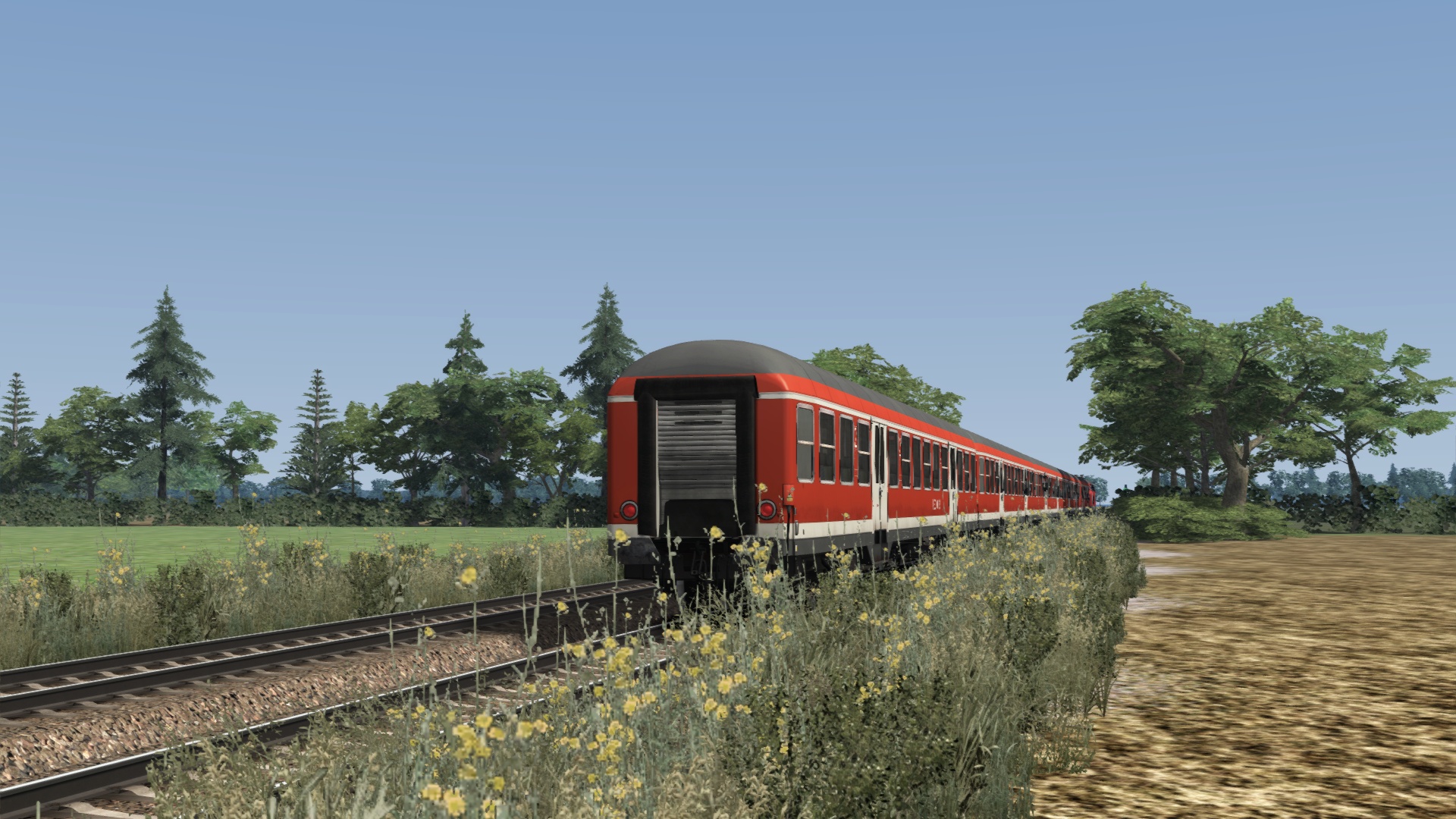 Während links eine Garnitur abgestellt ist, die am Wochenende nicht benötigt wird und rechts ein Sonderzug abgestellt ist, macht sich der Personenzug auf dem Weg in die Kreisstadt.Gruß