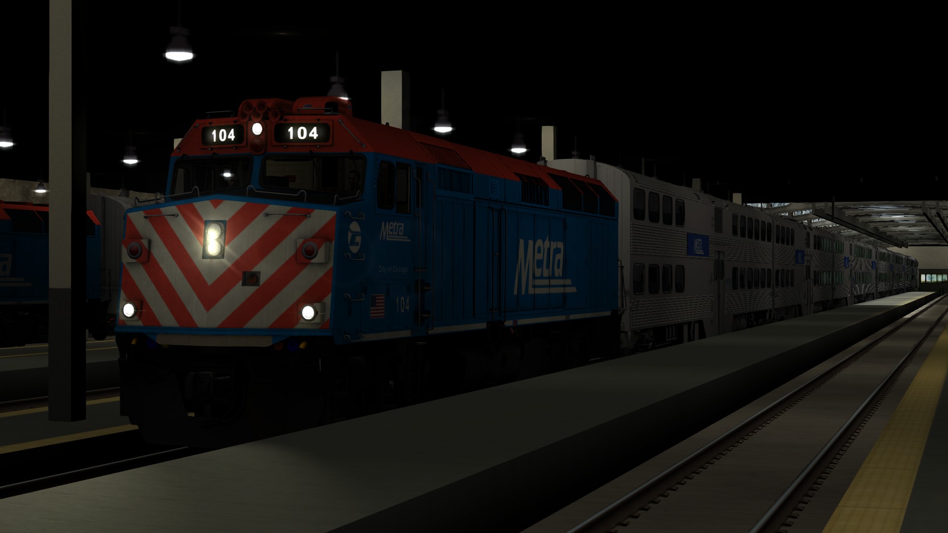Gefahren wird Metra F40PH-3 #104 "City of Chicago" (passend!) mit sieben Gallery-Cars als Metra Train 1287 von Chicago Union Station nach Aurora, Illinois. Dieser Zug fährt von Union Station aus non-stop bis Downers Grove, von dort aus geht's dann mit Halt an allen Stops bis zur Endstation weiter. Unser Zug steht bereit im Südflügel der Union Station in der "Windy City".