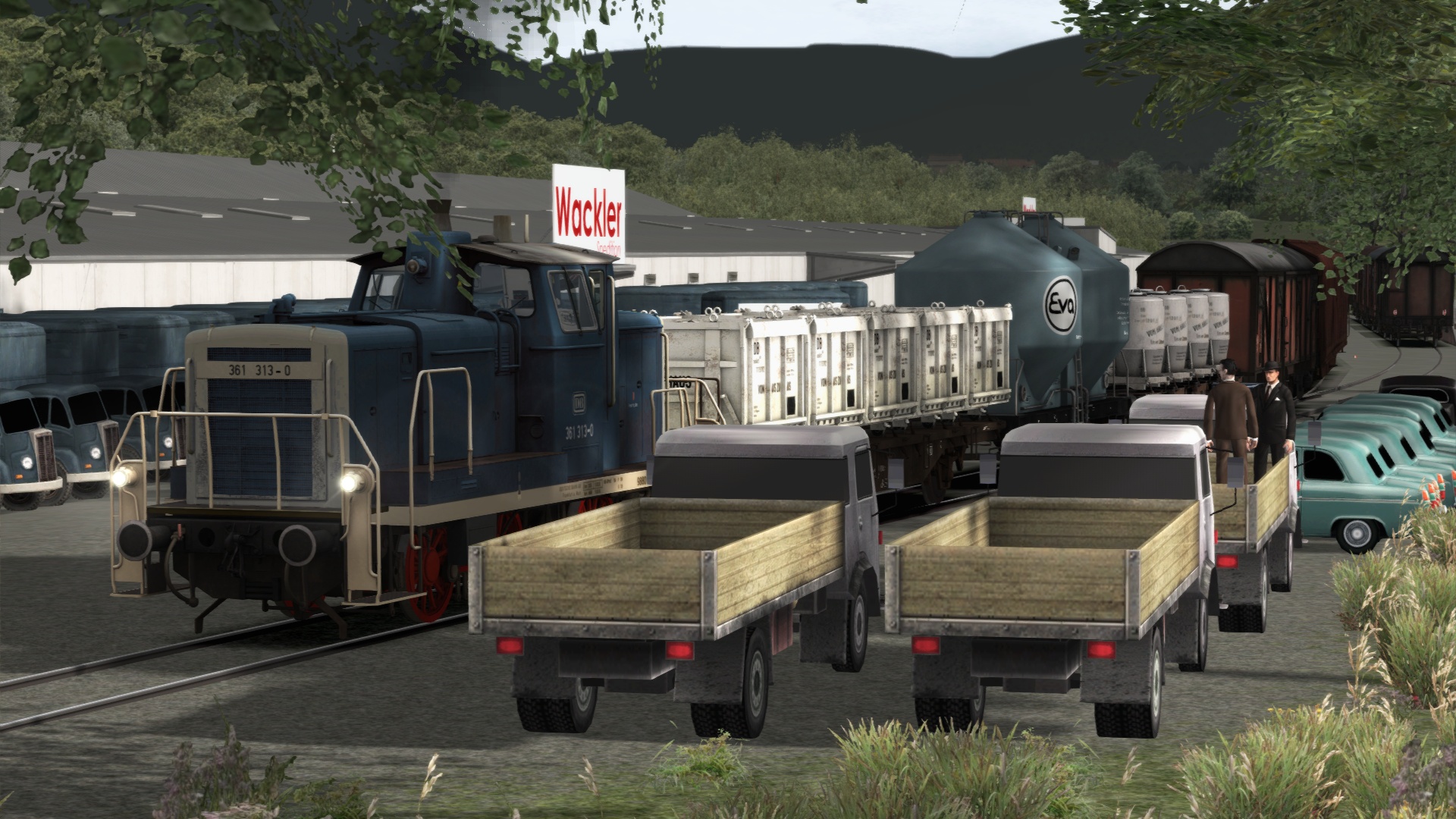 ...diese V10 C wird im Kühlschrankwerk auch schon schmerzlich vermisst, um die aufgebockten Wagen durch die 50m Kurve die 40‰ Steigung hoch ins Werk zu drücken...die Tu47 tut sich sichtlich schwer damit und die Tu29 ist mit Motorschaden vorm Lokschuppen liegengeblieben