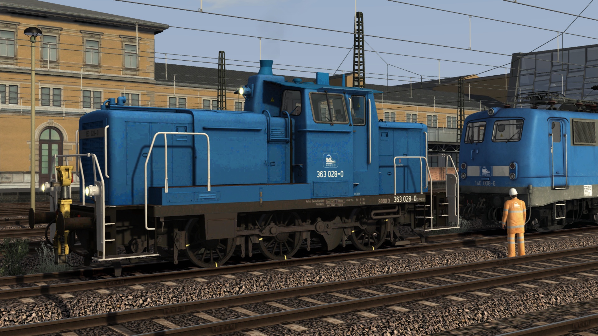 Die 363 nimmt ihre große Schwester an der Hand bzw. an den Puffern. Ich weiß nicht, ob die Rangieronkels der Pressnitztalbahn tatsächlich solche Jacken tragen, ich hab' dem Kamerad aber mal vorsorglich eine gepinselt.