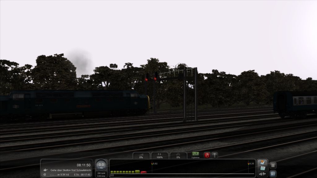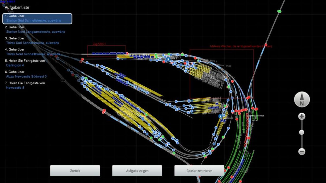 ich stehe mit meinem Schnellzug am Bahnsteig in Newcastle und soll laut Textmeldung um 8 Uhr 3 abfahren. Doch auch um 8 Uhr 16 zeigt das Ausfahrsignal noch Halt. Ein Zug mit der 55 022 hat Einfahrt am Nachbarbahnsteig, ein Zug mit der 37 621 hat Ausfahrt Richtung York. Nachdem dieser die Abzweigstelle Nord 01 passiert hat, geht die gerade überfahrende Weiche auf Abzweig ins Gegengleis. Die Weichen an der Abzweigstelle Nord 02 würden mich auch ins Gegengleis führen, wenn die Weiche hinter meinem Ausfahrsignal auf Abzweig schalten würde. Aufgrund der Weichenstellung an der Abzweigstelle Nord würde der Zug mit der 55 021 entgleisen, also bekommt er auch keine Einfahrt.