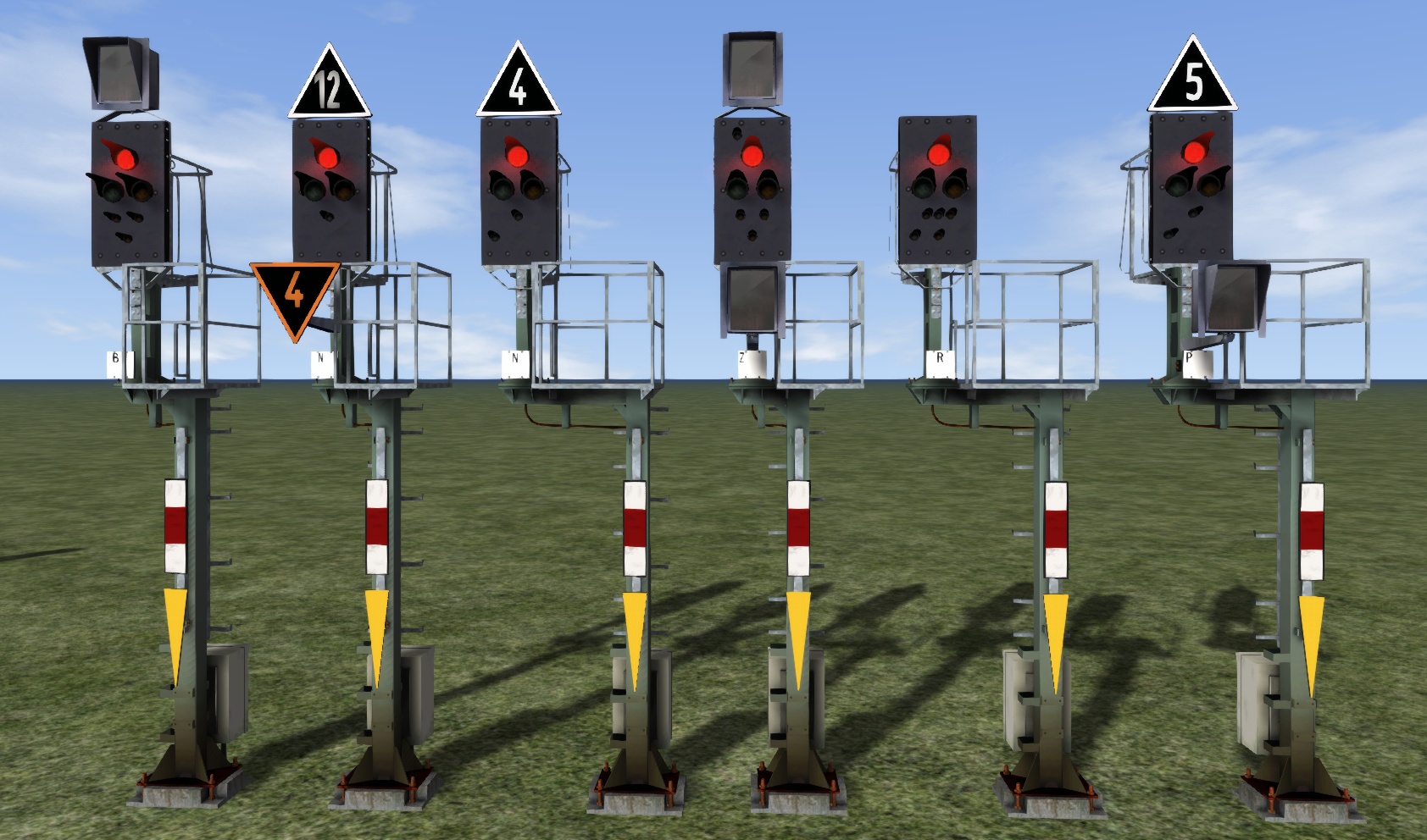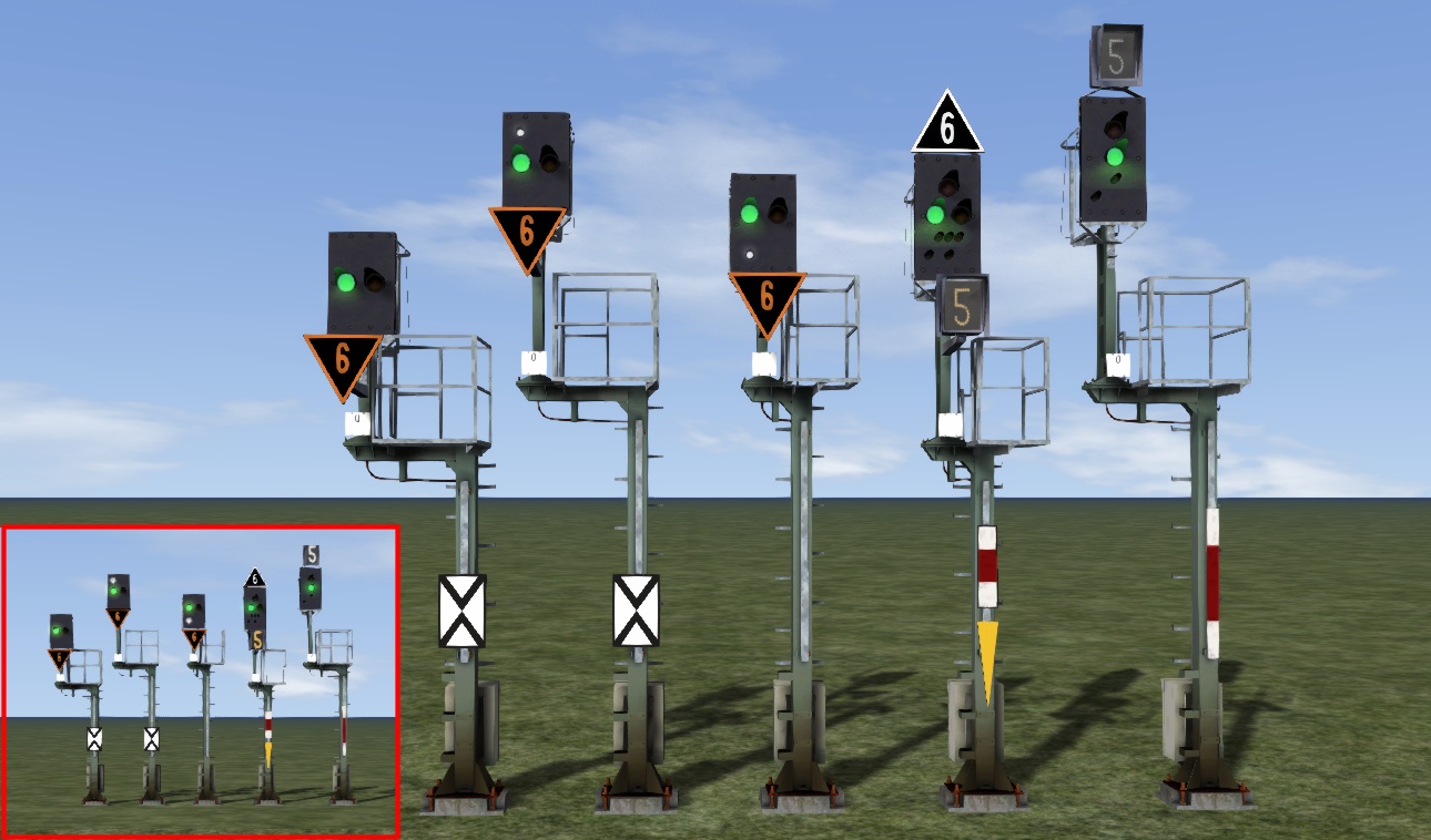 Bei allen diesen Mehrabschnittsignalen wurden je nach Automatik, Mastbezeichnung oder Anzahl der Links (0T oder 1+T) die Objekte ein- oder ausgeblendet. Zu beachten ist, dass teilweise nur eine einzige weiße Signaloptik für das Zs1 sichtbar ist oder ein Zs7 in Kombination mit einem Sh1. Und das alles noch in Kombination mit den Zusatzanzeigern...