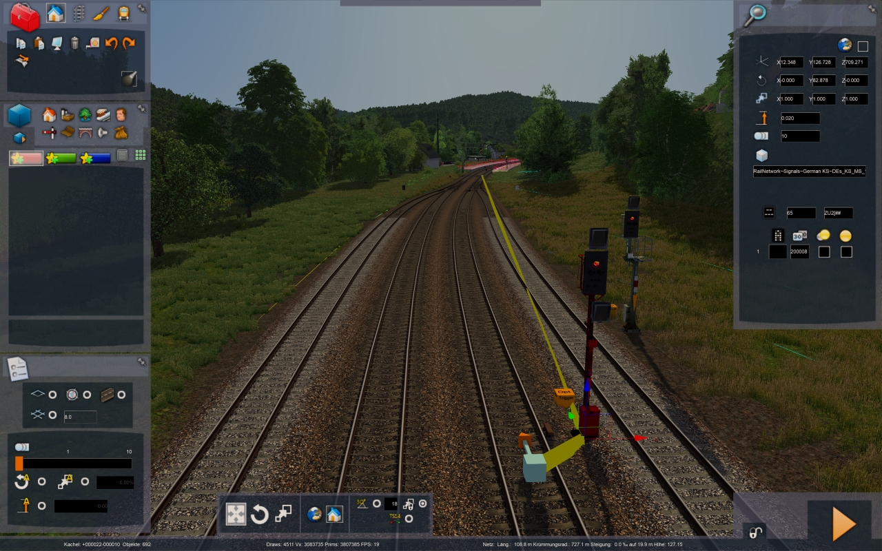 Der Optische Trigger Einzelsignal liegt jeweils direkt neben dem Würfel und hat den Eintrag "0ZS3V". Der Eintrag "200008" ist dafür gedacht, dass das Zs3 jeweils "8" zeigt, wenn das folgende Signal HP0 zeigt. So habe ich das zumindest der ReadMe entnommen. Der TS scheint aber den otpischen Trigger zu ignorieren und zeigt dennoch das Zs3v an, obwohl es in Realität nicht angebracht ist. Bei Bild 1 würde man es noch vermuten, da dann das Signal von Bild 2 kommt, was ja ebenfalls "8" zeigen kann. Aber komischerweise kein Zs3V angebracht. Bei Bild 2 ist es völlig sinnlos, da danach ein einfaches Blocksignal ohne Zs3 kommt - das Zs3v ist also so oder so sinnlos. Habe die Signale 3mal neu platziert, ich denke aber dass das Problem erst auftritt seitdem dort "200008" eingetragen wurde.