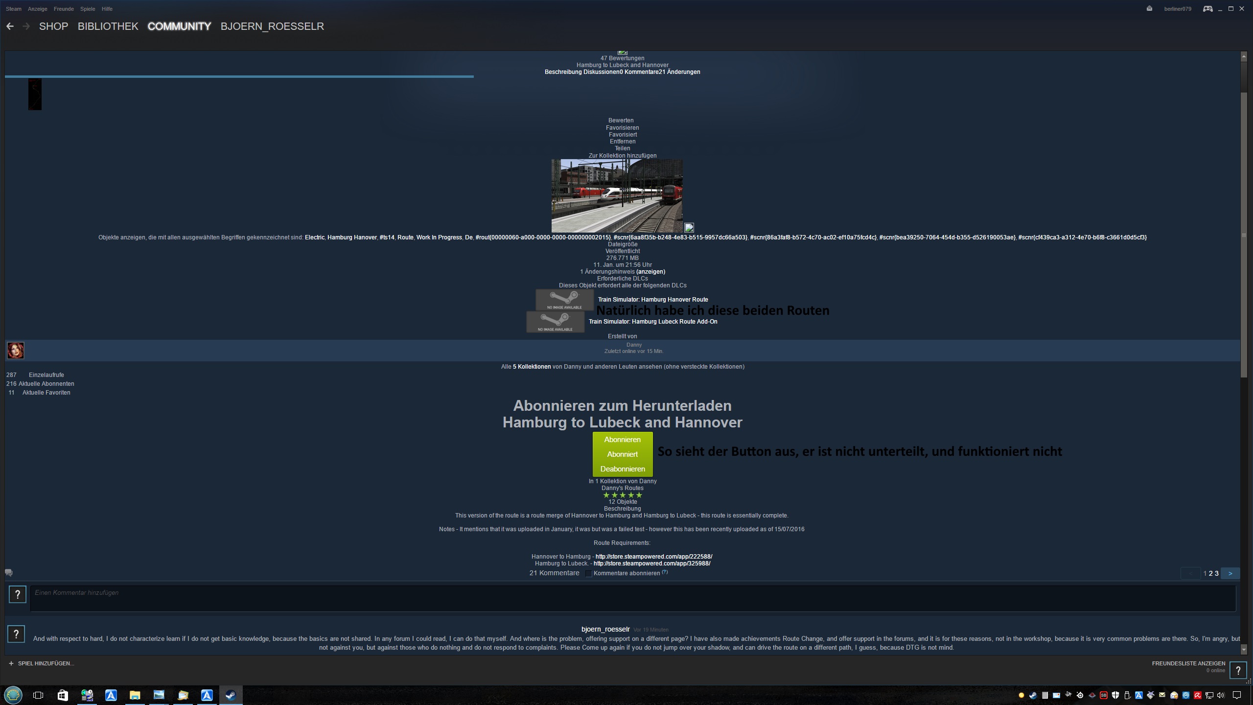 Hallo.Ich habe durch zufall im Steam-Workshop heraus gefunden, das jemand (Danny) die Strecke Hamburg-Lübeck mit Hamburg-Hannover verbunden hat, und das schon vor einiger Zeit.Im Workshop zu finden unter der Bezeichnung Hamburg to Lubeck and HannoverDie benötigten Strecken sind vorhanden.Da ich den TS soweit nur für die deutschen Strecken und Fahrzeuge "ausgedünnt" habe, und ich gerne auch mal mit einen GZ von Lübeck über HH nach Hannover fahren würde,wie es auch im Dreieck von Mü-GA-RO-AU möglich ist, wollte ich die Strecke abonieren, geht jedoch nicht, der Button sieht aus, wie auf den Bild zu sehen, funktioniert aber nicht.Auch im Browser oder über den TS sieht das aus wie auf den Bild.Steam angeschrieben, seit 14 Tagen, keine Reaktion, DTG angeschrieben, Rückmeldung, liegt an Steam.Nun seit ihr dran.Folgenes habe ich gemacht, mehrfachCache geleertNeu gestartetAuf Steam-update geachtet(Deinstallation kommt nicht in frage, mein TS hat über 180GB, das sind 2 Tage neu installation)Ab/AngemeldetDTG angeschrieben (Vor 14 Tagen, antwort nach 3 Tagen, Steam anschreiben)Steam angeschrieben (Auch vor 14 Tagen, paralell zu DTG), Antwort: KEINE.Hat jemand die Route und kennt jemand eine alternative möglichkeit die zu bekommen?Hat jemand weitere Vorschläge, welche ich machen könnte?Vielen Dank