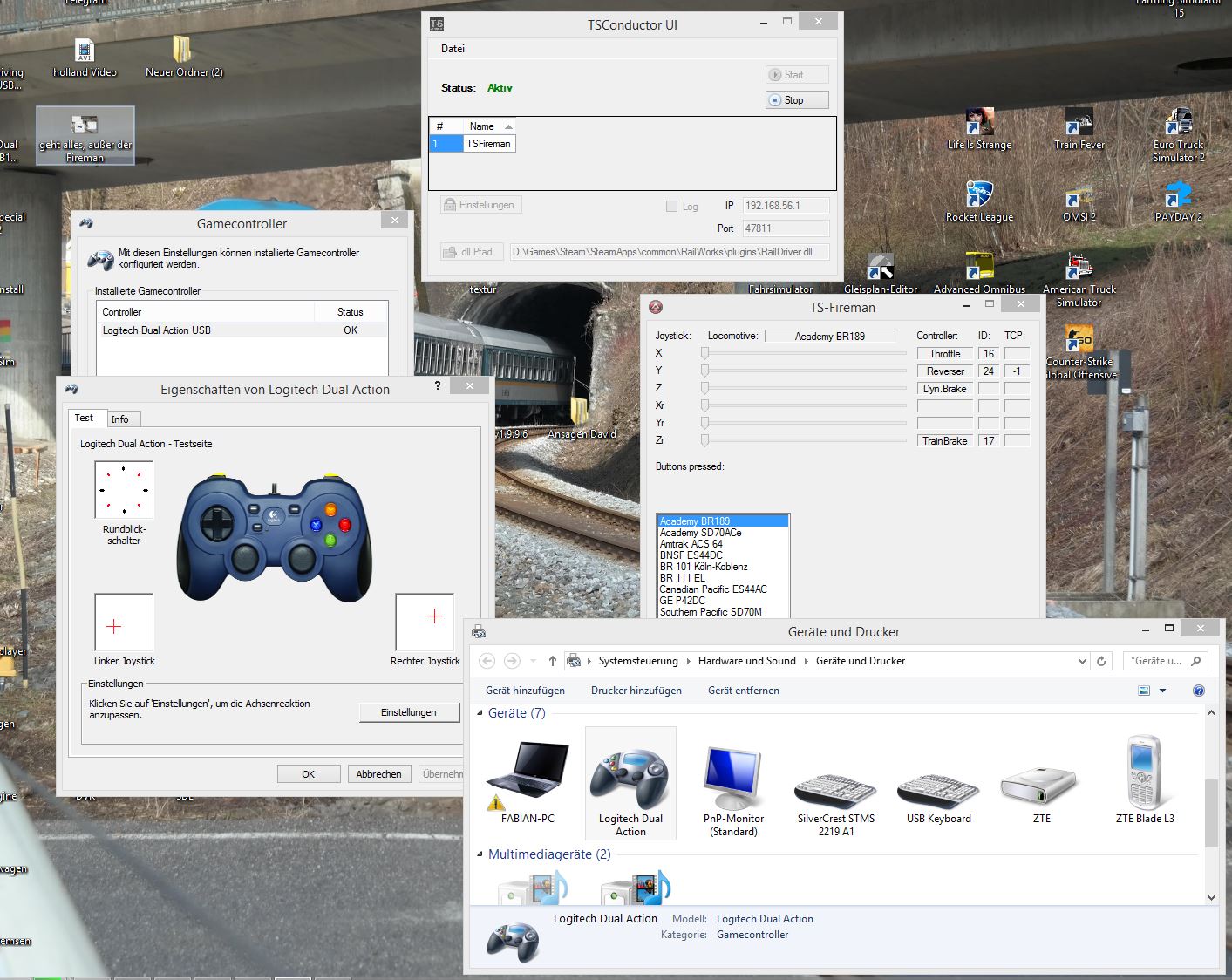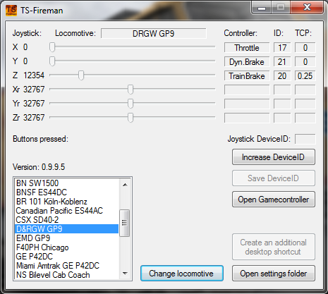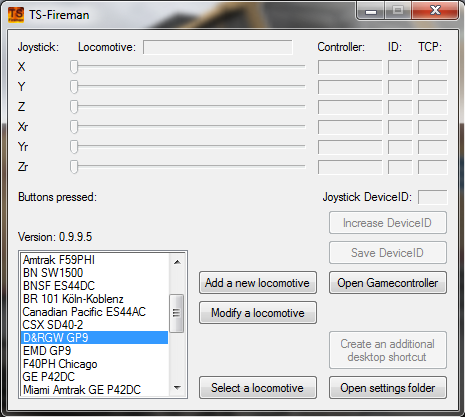 Es setzt die Bewegungen von maximal sechs Joystickachsen in TCP-Befehle um, welche über den TCP Server an den Train Simulator gesendet werden. Ein Empfang von Daten ist auch möglich. Vorerst nutze ich diesen nur für das Auslesen der Controller der aktiven Lokomotive, um eine neue Lok der Auswahlliste hinzuzufügen oder zu modifizieren. Seit dem Update auf 0.9.9.0 ist auch das parallele Ausführen von mehreren Instanzen des TS-Fireman möglich. Wodurch man mehr als nur einen Joystick (auch Arcaze o.ä.) nutzen kann. Dazu können, vom Programm, zusätzliche Verknüpfungen auf dem Desktop angelegt werden.