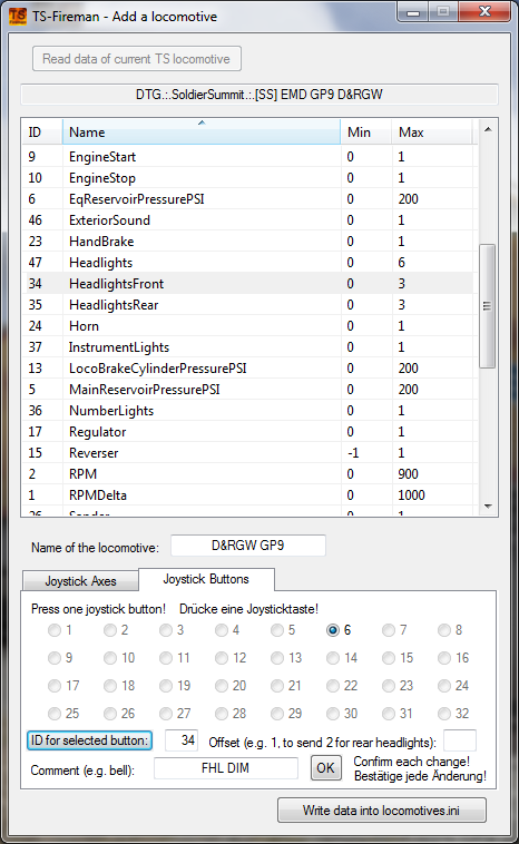 - der Joystick-Button 1 wird nun ausgewertet (als Taster), die zuzuweisende TS ControllerID schreibt man in die locomotives.ini bei der Lok unter "Button1Id = "