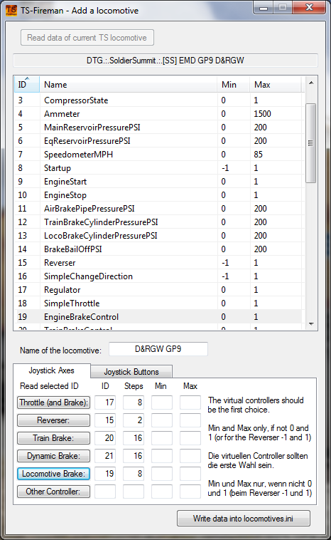 When creating new locomotives ("Add a new locomotive") you only have to search for the ID of the respective controller from the received list. This list is sortable and a line can be read out via click on the Axis-Button (actual version feature). VirtualThrottle or Regulator, Reverser and VirtualBrake or TrainBrake have proven themselves with me. Sometimes you have to try out which ID works. For vR (virtual Railroads) locos, it's best to select the controller VirtualThrottle and Brake.