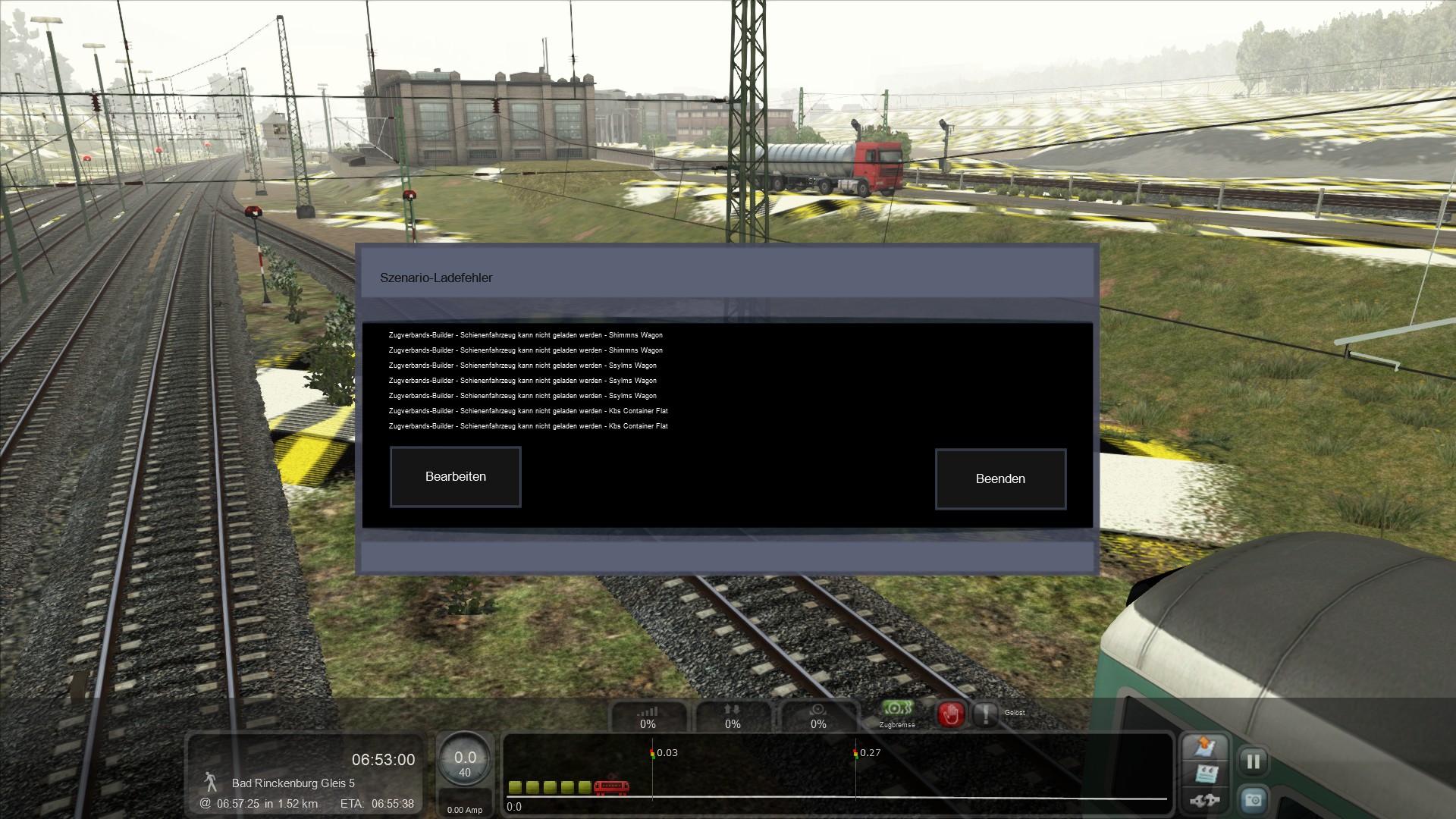 Nun wollte ich Anfangen zu fahren, als ich aber das Szenario fertig geladen hatte, kam eine rieseige Liste mit Fehlern, dazu kommt, dass die Karte eine Art "Dummy-Textur" hat, also kein Rasen oder so zu sehen ist.