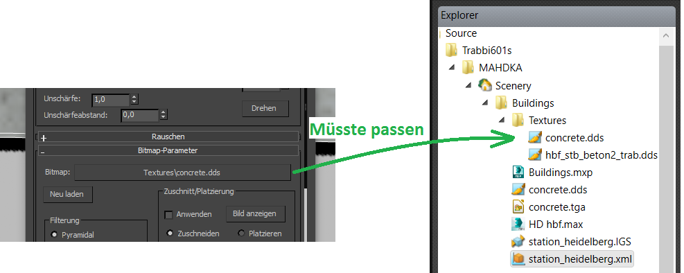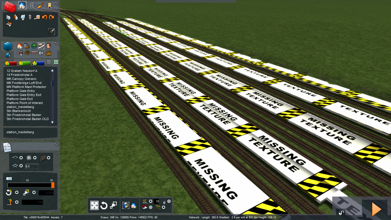 Nun aber zu meinem Problem: Ich hab mir vor kurzem den Train Sim 2017 gegönnt und irgendwie bin ich recht schnell im Editor hängen geblieben. Mein aktueller Plan ist es auf der Strecke Mannheim - Karlsruhe die parallele Strecke über Heidelberg und Bruchsal dran zu frickeln. Warum? persönliche Gründe, ich komme von da und fand das witzig... Also Schienen bis nach Wiesloch/Walldorf zur HDM gelegt und dann wollte ich mal eigene Objekte modellieren. Also alles an Tutorial gesucht, was ich finden Konnte, die Bahnsteige von Heidelberg rudimentär modelliert -> RW Material drauf mit TexDiffuse Shader (TrainBasicObjectDiffuse habe ich auch versucht) -> einfache Textur (256 x 256 px) drauf gekachelt -> als Kuju IGB exportiert -> im Blueprint Editor ein Scene Blueprint erstellt -> Anzeigename und Modell eingetragen Exportiert -> mich schon im Train Sim gefreut, dass alles so problemlos geklappt hat -> Modell ausgewählt -> nur die "Missing Texture" Textur zu sehen.