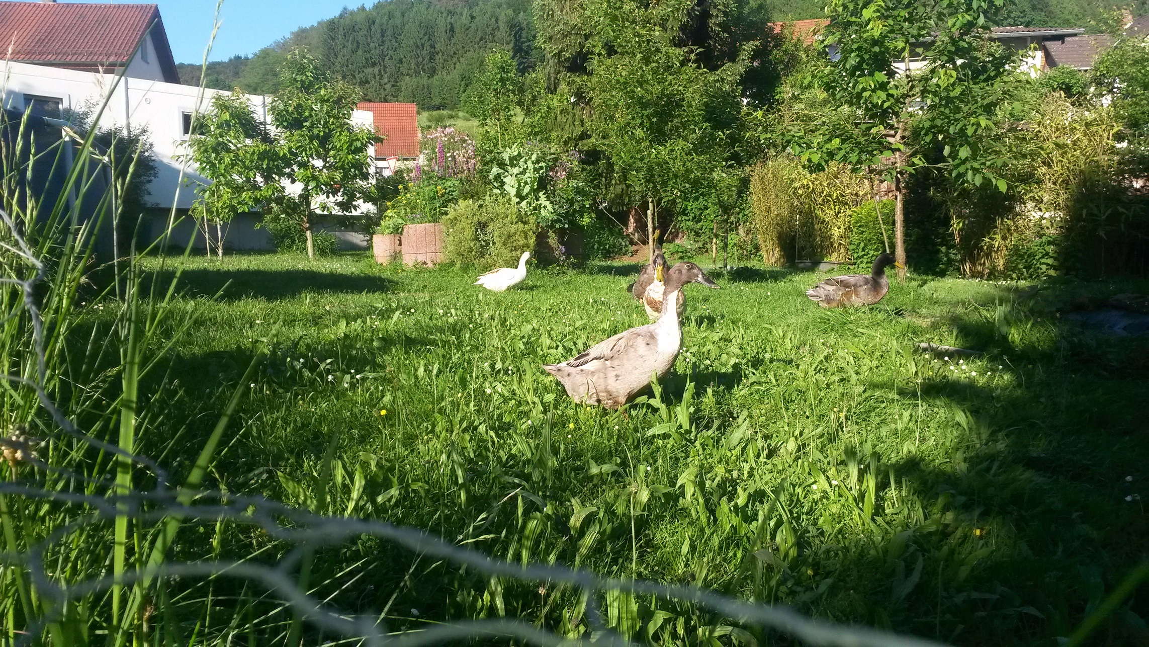 Laufenten, sie gehören meiner Schwester und haben ordentlich Auslauf sowie einen kleinen Teich. Ein sehr gutes Mittel gegen Schnecken ![]()