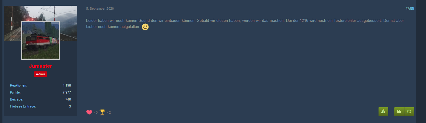 Wobei ich ja sagen muss, dass ich immer noch total begeistert von linusf letzter Veröffentlichung (BR 152) bin. 😅 Selbst die Geräusche beim Auf- und Abrüsten machen einfach Laune. Könnte stundenlang "Lok Hoch- und Herunterfahren" spielen. 😂