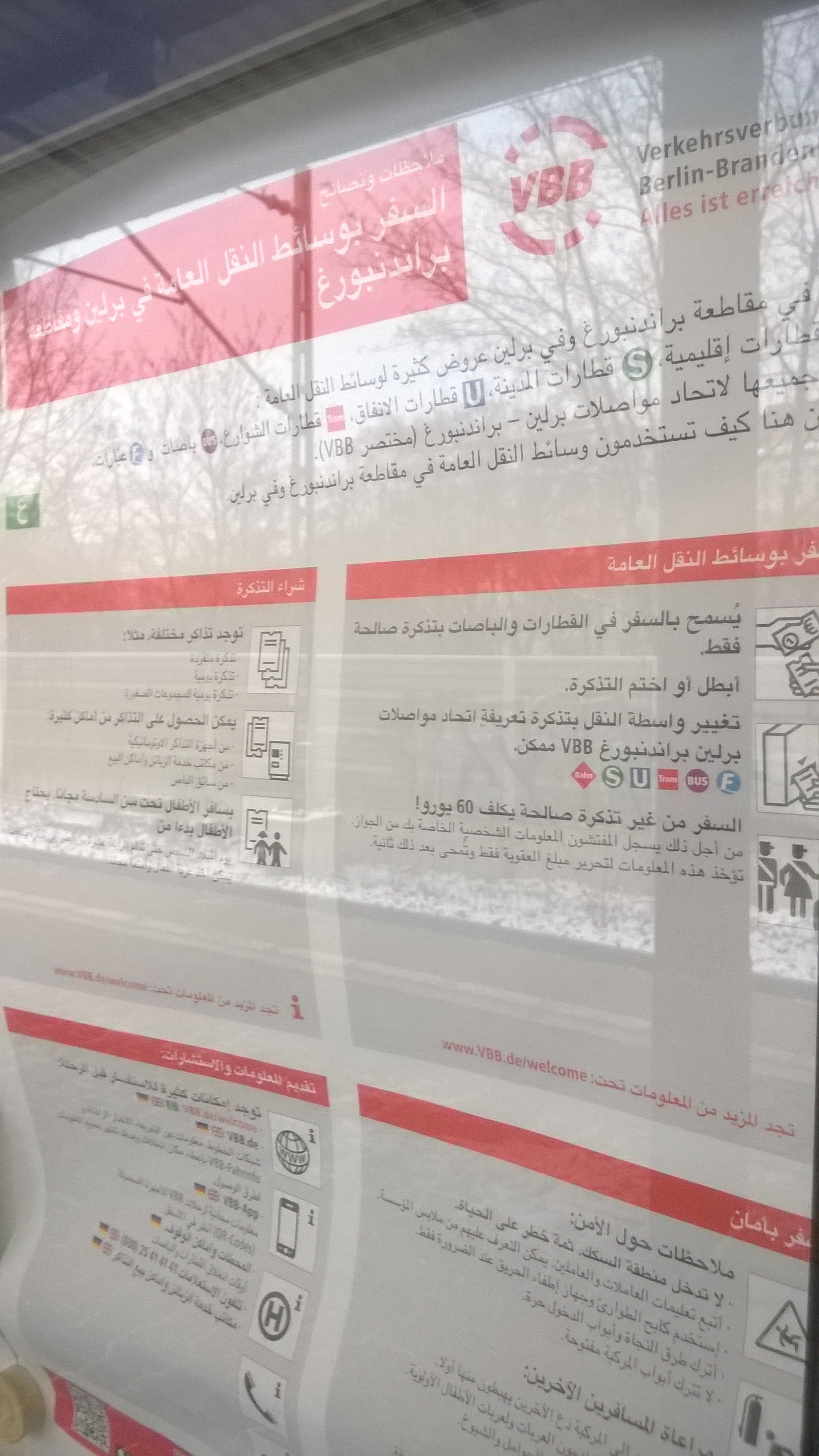 Übrigens hatte ich da, garnicht lange her, irgendwann mal die VBB Infos auf arabisch entdeckt. Macht sogar Sinn finde ich, weil mich schon viele von denen angesprochen haben um zu fragen, wo sie hin müssen und da sie oft weder Deutsch noch Englisch können, funktionierte die Kommunikation nur mit Händen und Füßen irgendwie. Zum Glück haben die meist eine Reiseverbindung auf Papier gedruckt in der Hand gehabt, sonst hätte ich denen garnicht helfen können.