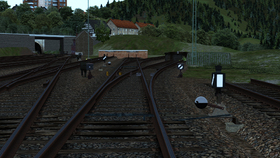 Es gibt dann noch das Schild "Bahnhof-Streckentrennung Ende"; das ist dasselbe Schild, nur dass das Symbol mit einem roten Strich (Links oben quer nach rechts unten) durchgestrichen ist.