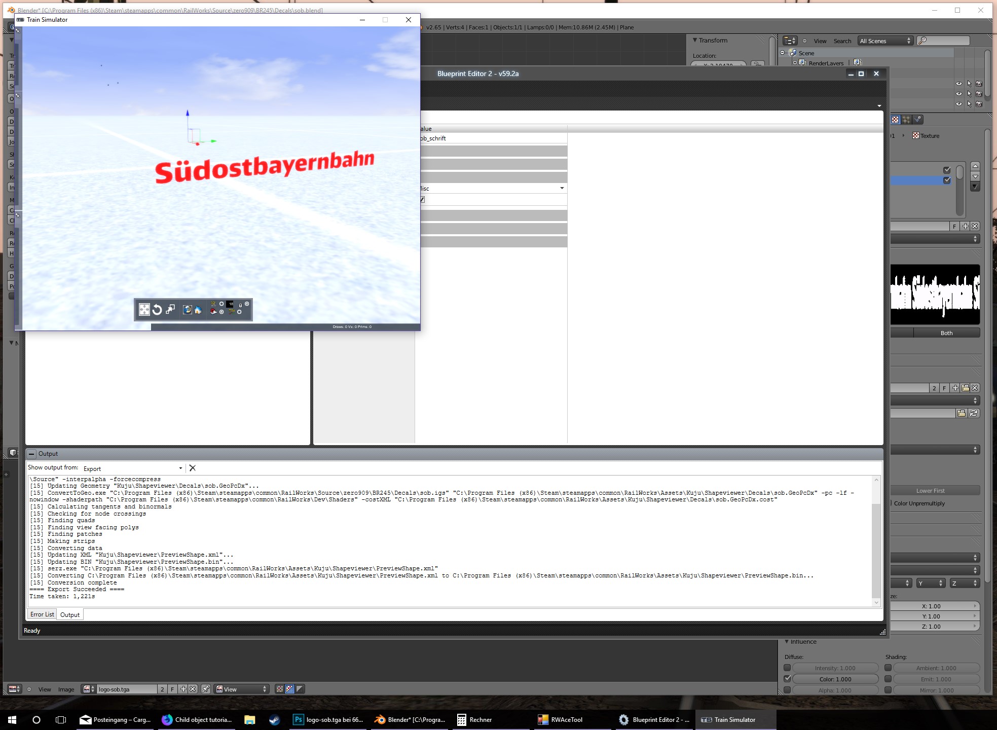 Ein erstes Ergebnis ist jetzt die RSSLO 245 Südostbayernbahn. Da die Textur im Bereich der seitlichen Abdeckungen gespiegelt ist, konnte ich den Schriftzug nur per Childobject unterbringen.