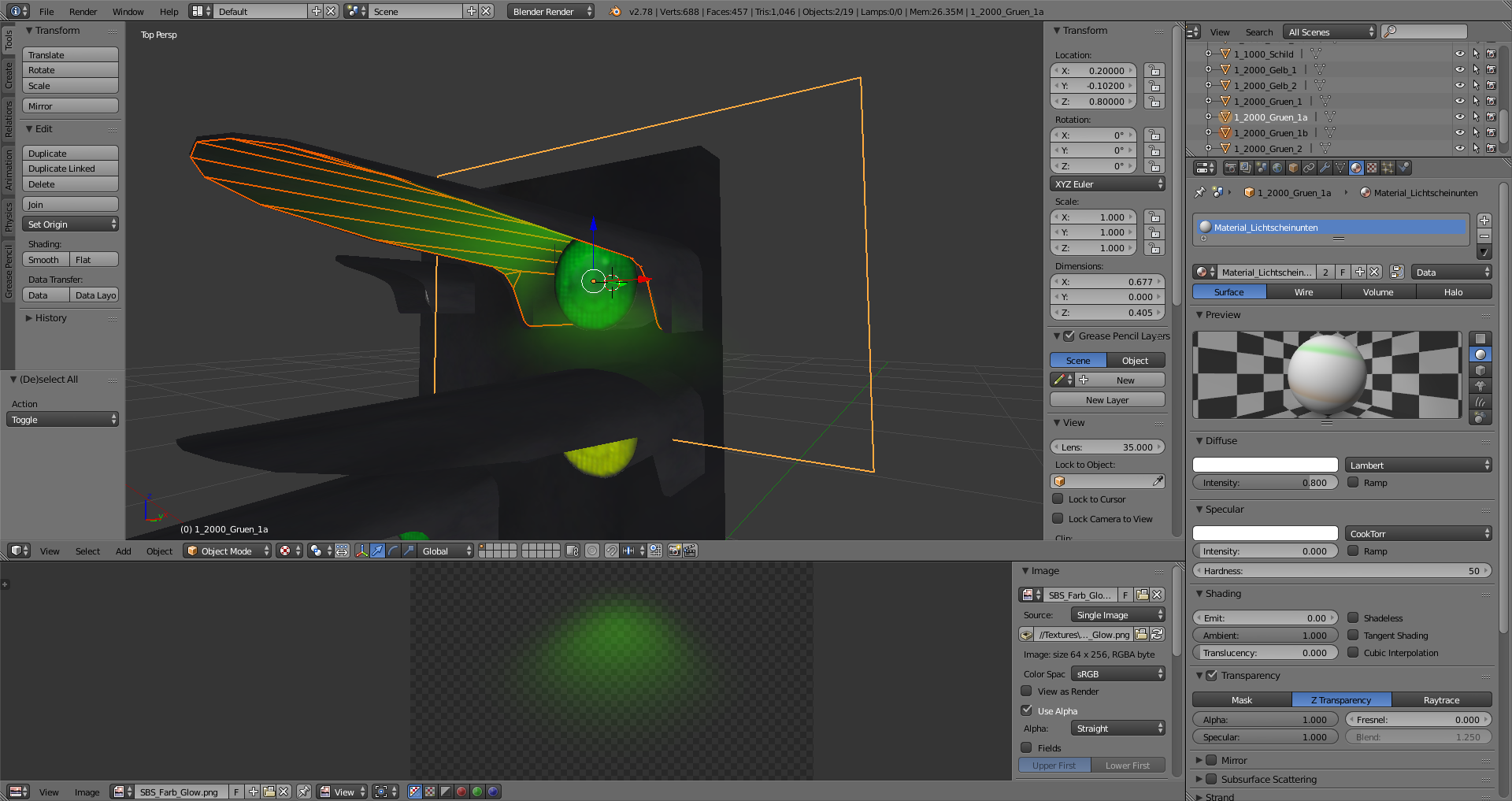 Für den Lichtschein in der Hutze und den nach unten hab ich "AddATex" verwendet (genauso wie bei meinen Nebenbahnsignalen) - Alphakanal wird nicht richtig verwendet, ist eher so ein schwarz/weiß Alphakanal.