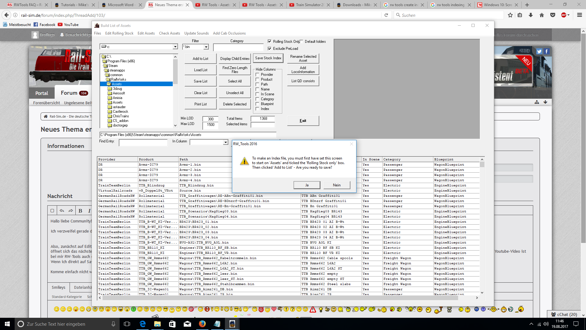 Ich verzweifel gerade daran, mit RW-Tools eine Indexliste meines rolling stock zu erstellen. Handbuch und das entsprechende Youtube-Video helfen mir leider nicht weiter.
