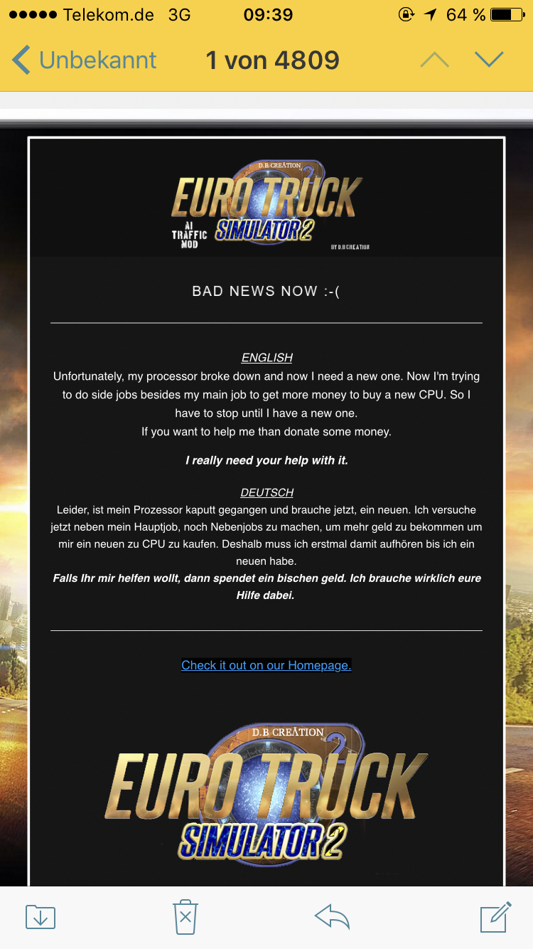 Und wen interessiert es hier nun ob irgendein AI Traffic Mod für den ETS 2 zwischenzeitlich nicht weiter entwickelt wird?
