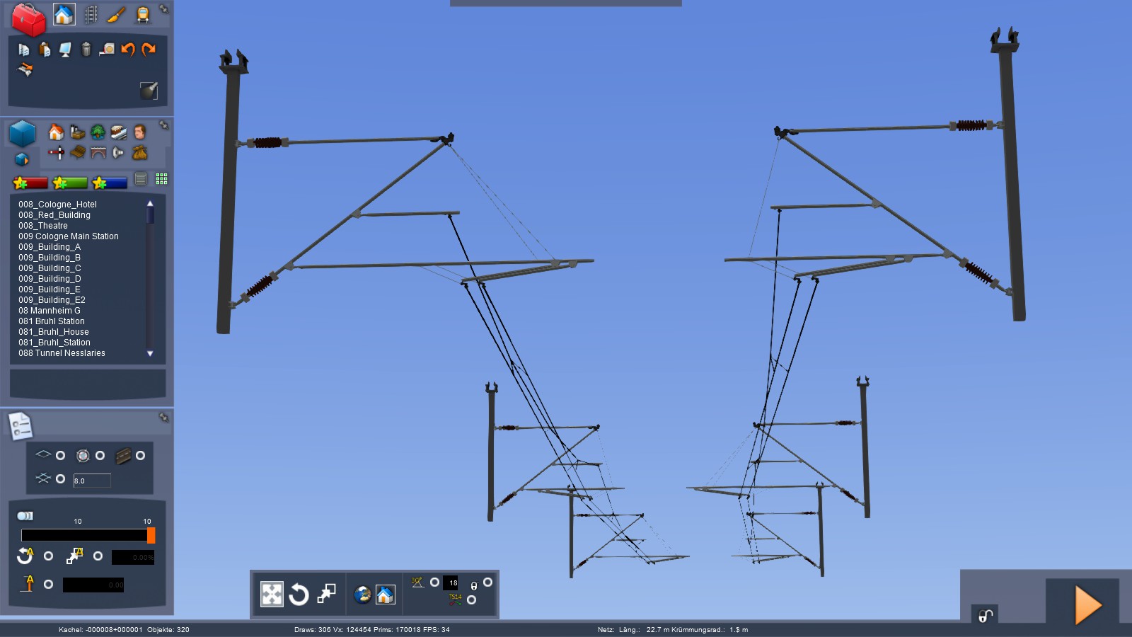 Für den schöneren Fahrleitungsausleger habe ich 3 Masten genommen: einen mit 20 cm abstand zu 0, einen 0 oder 40 jenachdem ob Gerade oder in der Kurve, diese sind niedrig damit es unter die Brücke passt. Als dritten Mast wurde ein ganz normaler genommen mit ca. 2-3mm astand zu den anderen Masten (OL Verlegung hätte probleme - ist aber kaum zu sehen bei milimeterarbeit)Hier das Beispiel wie es aussieht. (der normale Ausleger wird am schluss wieder gelöscht)
