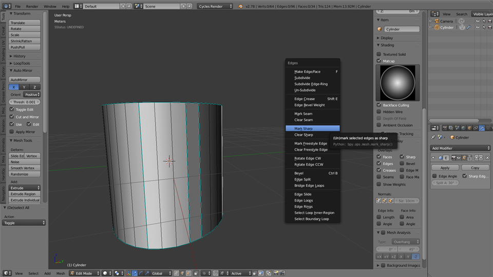 Habe eine Frage zu Abgewinkelten Rohren. Die Vertikalen Knicke müssen Kanten bleiben (im Bild Blau). Alle 14 Horizontalen Ecken der Röhre (Gelb) sollen als runde Rohr-Segmente zwischen den abgekanten Ecken erscheinen. Habe Blender 2.79.
