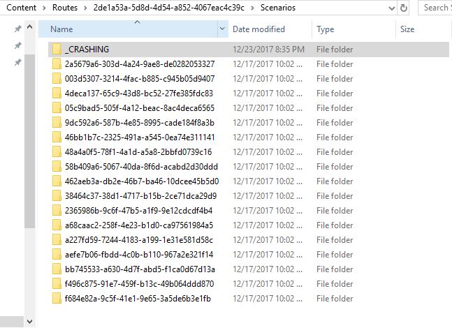 9. Nun, innerhalb der betroffenen Route, im "Scenarios" Order, alle Szenarien "isolieren" (z.B. in einen neuen Unterordner "_CRASHING" schieben, und ein Szenario nach dem anderen testen (jedesmal wenn Du EIN Szenario wieder in den "Scenarios" Ordner verschiebst, das Spiel neu starten.