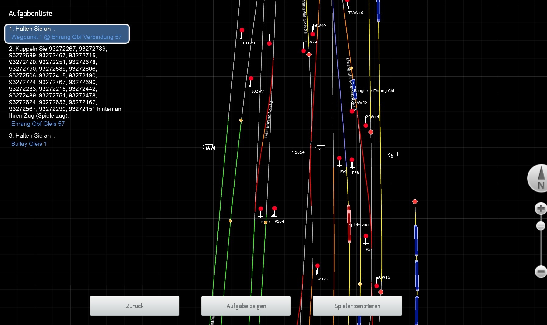 Hab mal nen Screenshot von der F9-Sicht im Spiel (also nicht im Editor) gemacht. Der Rangierer steht gerad an seinem Wendepunkt und fährt dann rückwärts (also im Bild nach unten) entlang der roten Fahrstraße in ein Stumpfgleis.