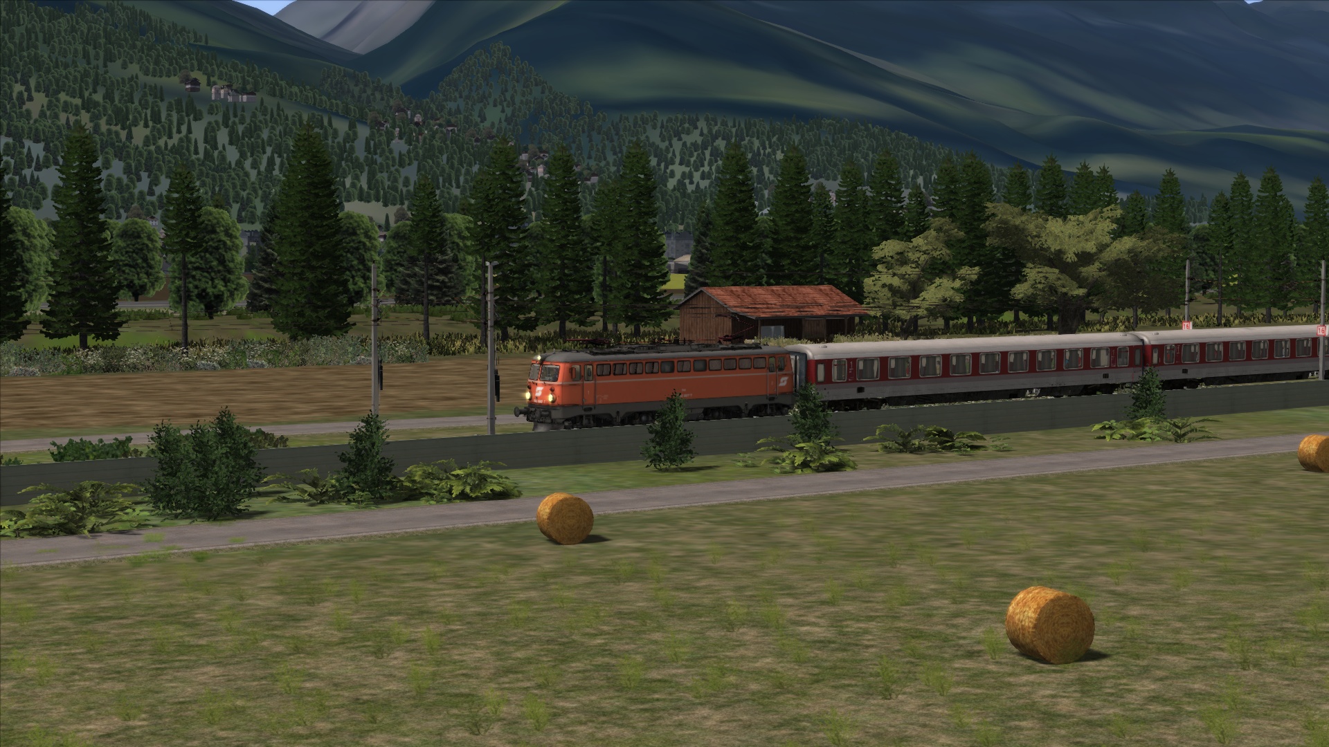 Mit der ÖBB Rh 1042 dem Brenner hinauf. Szenario OBB 1042 Brenner Zug, Personenwagen sind getauscht.
