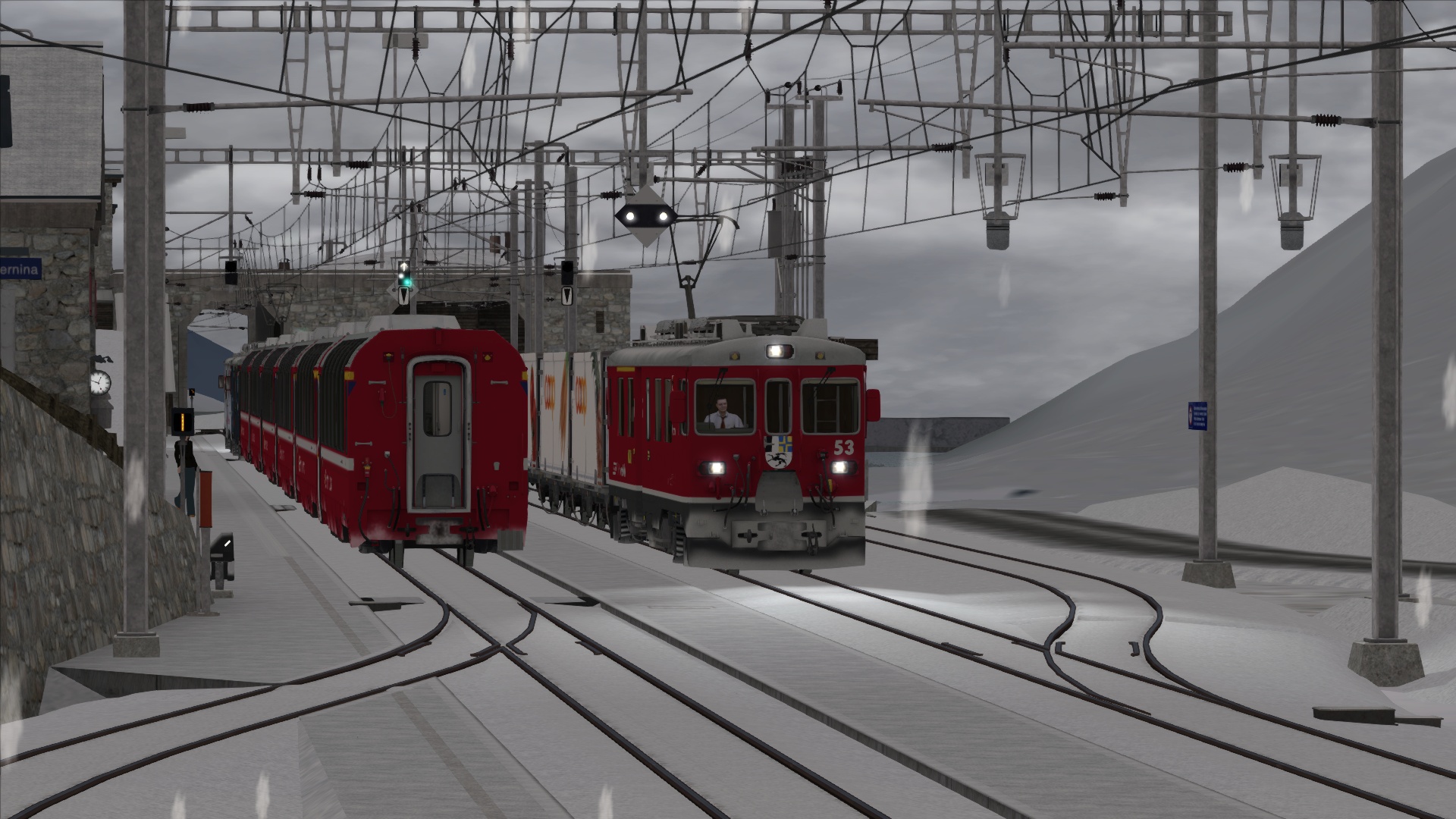 Mischzug von Poschiavo nach Pontresina. Zum Teil,hat es starker Schneefall.